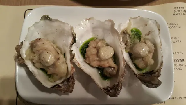 頭盤炸天婦羅法國生蠔配黑松露蛋黃醬及菠菜忌廉茸。一口吃下去蠔邊香脆蠔肉的鮮甜,加上黑松露和菠菜茸令蠔味更突出,更多味道層次。頗大的紐西蘭蜆清甜無沙,混埋醬汁一齊,散發陣陣新鮮香味。意粉吃起來煙韌帶清淡。