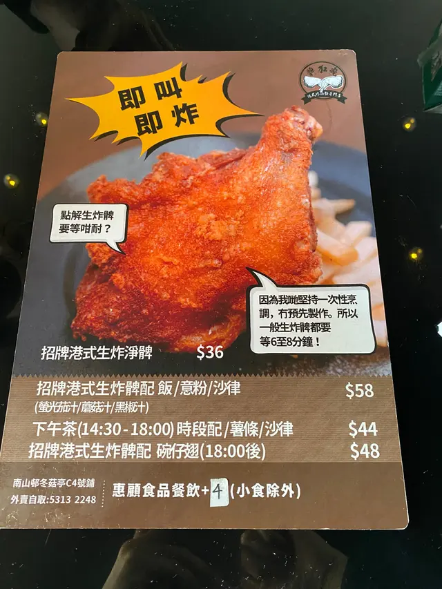 在賽馬會藝術中心抖夠後,要發掘石硤尾其他美食,一路散步行去南山邨,而今次食炸雞髀🍗位於冬菇亭熟食中心,旁邊亦有其他小食店大排長龍,而我和T先生揀選炸髀,即叫那炸,而且有地方比我地坐住等和食。堂食的話是用QR code下單,見是下午茶時段,配埋沙律再另加$4 配紙盒茉莉花茶。招牌港式生炸髀 配沙律等侯時間約6-8分鐘,剛剛炸起的雞髀,很脹卜卜,望落去塊雞皮好脆很香口,一口咬下,外脆內嫩,亦有很充分的雞髀肉汁,口感很不錯。跟餐的沙律,很有懷舊感覺,不太甜和多醬,青瓜亦很爽口,能夠減減一點油膩和熱氣。在南山邨比較舊式的公共屋邨嘆一個下午茶,真的別有一番風味呢😇😊…查看更多