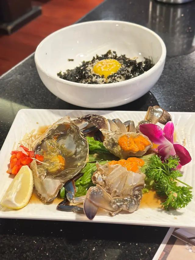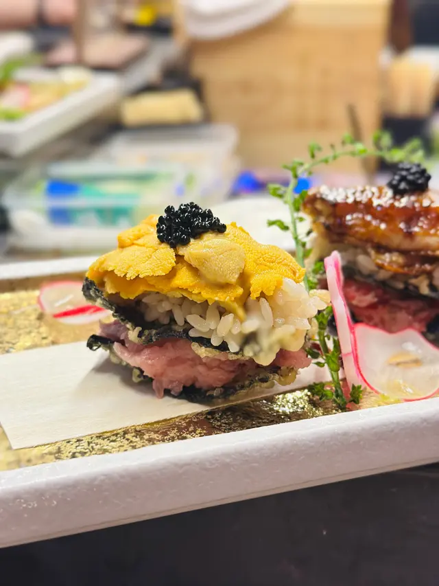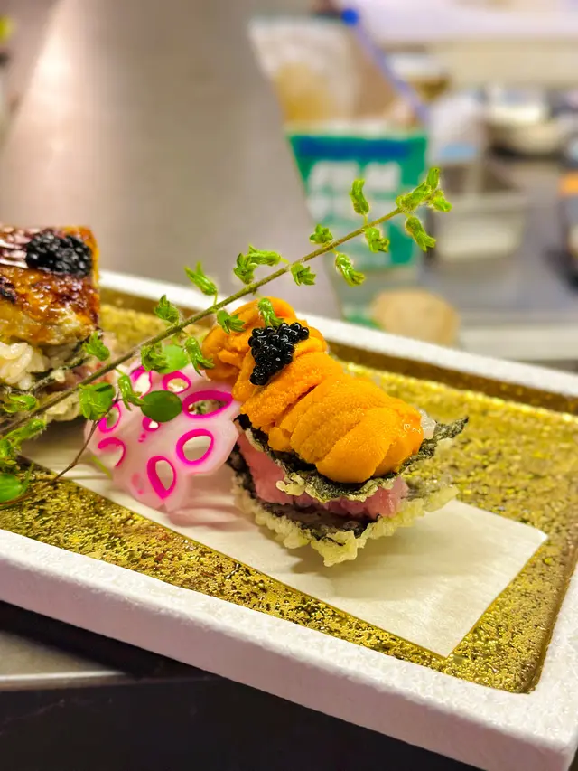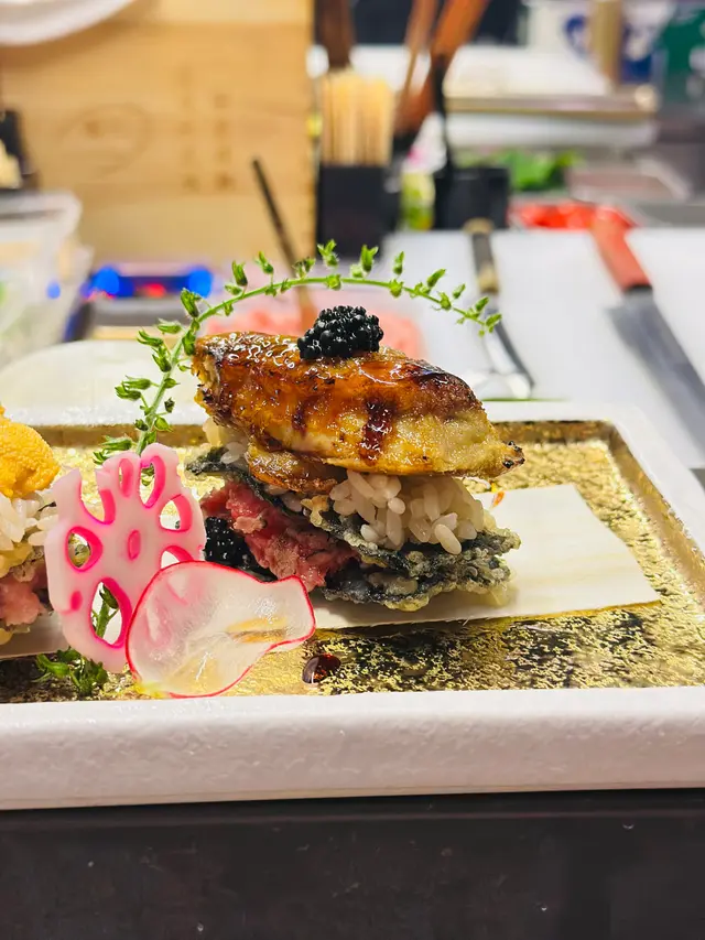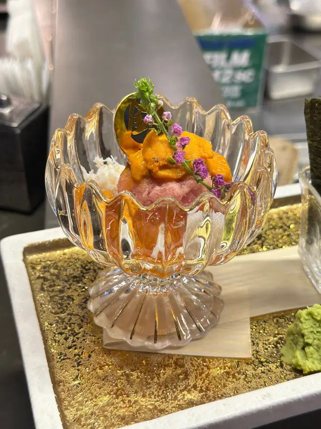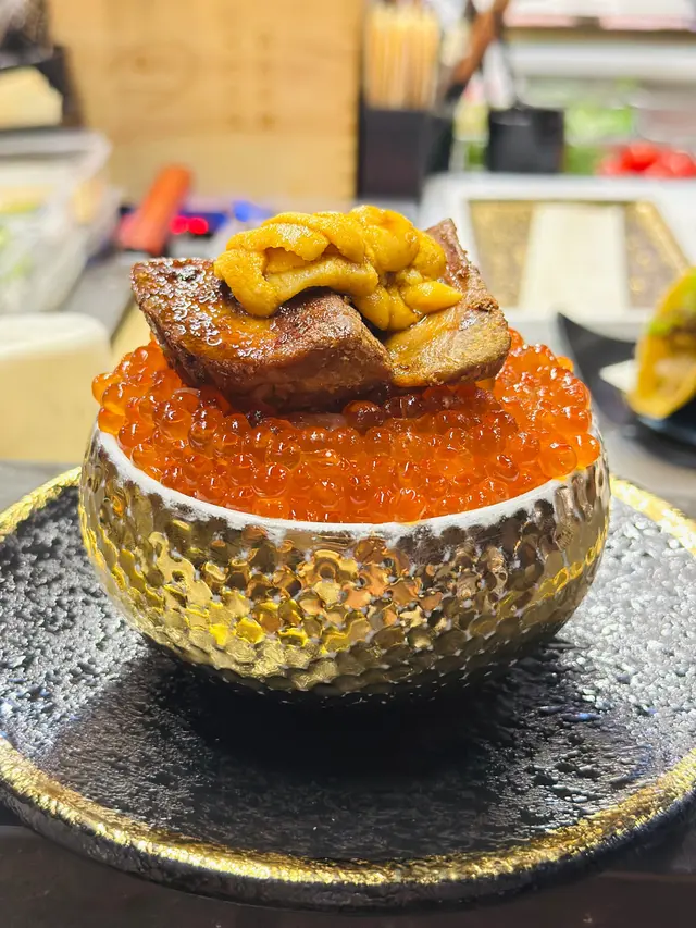見到呢間啲三文魚籽同埋海膽,仲有咁正嘅串燒,真係肥咗唔好問點解🙈海膽拖羅蓉千層脆脆➡️面層係厚厚嘅海膽,配上香滑嘅拖羅蓉,口感層次豐富焦糖鵝肝和牛千層脆脆➡️焦糖鵝肝香脆滑嫩,和牛香濃,既精緻又奢華嘅創意料理滿丼。海膽鵝肝三文魚籽飯➡️滿滿嘅三文魚籽真係好吸睛,搭配香甜嘅海膽➕濃郁嘅鵝肝,每一口都充滿海洋嘅鮮甜與鵝肝嘅香濃滑潤金酒杯➡️呢個打卡好靚,🈶鮮甜嘅海膽、油潤嘅拖羅蓉、香甜嘅松葉蟹肉➕爆漿三文魚籽,係一道充滿儀式感嘅日式佳餚金龍珠海膽吞拿魚蓉卷➡️雞蛋黃呈橙色,搭配海膽➕吞拿魚蓉,口感細膩,鮮味濃厚炙燒爆膏四頭巨型虎蝦➡️好大條蝦,咬落充滿濃郁嘅蝦膏香氣,蝦肉鮮嫩彈牙自家製雞皮蝦串燒➡️外皮酥脆,蝦肉Q彈厚燒牛舌心串燒➡️切片厚實,入口鮮嫩多汁西班牙豬肋條串燒➡️燒烤至外層微焦,肉質香滑黑豚五花腩串燒➡️肥瘦相間,油脂細膩香口…查看更多