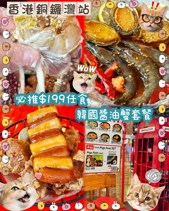 Bingo & Cook 🍗📍香港銅鑼灣駱克道491-499號京都廣場2樓(港鐵銅鑼灣站C出口,步行1分鐘)➽➽➽➽➽➽➽➽➽➽➽➽➽➽➽➽➽➽➽➽➽今次食既 $199 任食既醬油蟹套餐,當中包括左醬油蟹、蟹肉飯、炒牛肉、泡菜湯炸雞等等⋯⋯ 全部都係無限量任食😆。而佢地單點既醬油鮑魚同埋醬油蝦都好推介既。而環境方面,設有好多打卡位,鍾意影相既朋友仔就一定唔可以錯過啦~超有韓國feel😍。🌟 醬油蟹 無限任食 $199 (食物包括⏬️)🔺 醬油蟹+蟹肉飯🔺 烤肉🔺 醬油湯🔺炸雞🔺 醬油煎餅🔺餃子🔺飲品🌟醬油蝦 /3隻 $70🌟醬油鮑魚 / 3隻 $70🌟炸魷魚 $78➽➽➽➽➽➽➽➽➽➽➽➽➽➽➽➽➽➽➽➽➽…查看更多