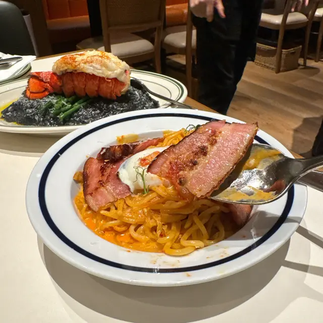 百訪不厭,食物水準👍亦係食梳乎厘pancake嘅好地方隔咗一排再去,又見有新菜式推出🔅Lobster squid ink risotto $228龍蝦肉已被細心處理剝殼,肉質彈牙,帶少少焦香墨魚汁味道好濃郁,但係只要伴上蕃茄粒粒一齊食,就可以減低膩感🔅Korean Kimchi Pork Pasta $158厚切嘅蜜糖鹿兒島煙肉,甜甜地又軟嫩醬汁加入泡菜,聞落香噴噴,又手工意粉做到al dente,又掛汁🔅Mango Pomelo Sago Pancake $138梳乎厘pancake 充滿蛋香、空氣感十足,軟綿濕潤配搭爽甜嘅甘柚同芒果,而血橙醬帶酸,整體清新,超滿足…查看更多