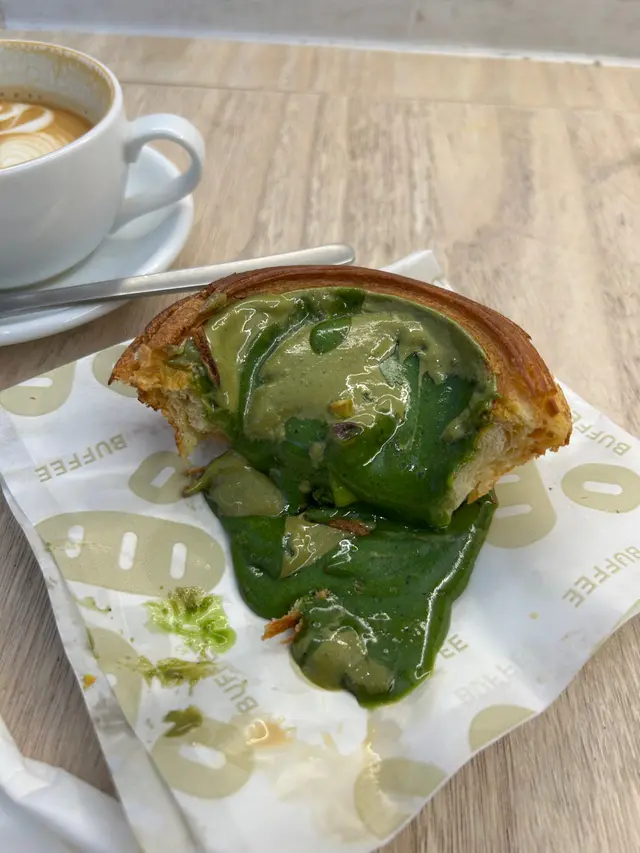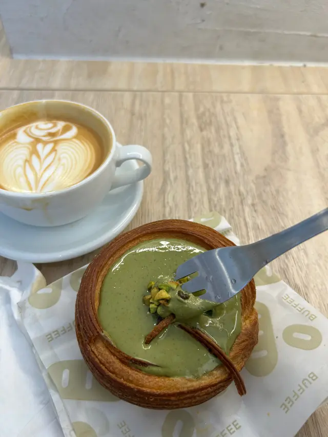 流心開心果撻~ 被他的賣相吸引,特登來買個現場食,店員把這個撻翻熱,酥皮脆是理所當然的。餡料係就夠晒流,流到成個碟都係,都唔緊要,視覺上有綠色,但好可惜,食唔到預期中好濃嘅開心果味,應該係話,食唔到明顯開心果味,只係綠色液體係咁流,個人覺得名過於實,不會回購。至於杯咖啡,正常發揮。…查看更多