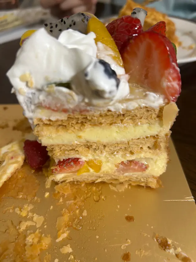 家人喺帝苑餅店中環IFC Pop Store訂咗呢個雜果拿破崙,首先去搵呢間位置乙,已經非常困難,因為地點不起眼,沒有招牌,指示又不清晰,見不需要過尖沙咀取,不妨一試。我們選擇下午5:00取餅,夜晚飯後8:00食,很久未吃過他的拿破崙,記憶中十分脆口甜度適中,這是五六年前的事,今日食返大大退步得好緊要!!!!!首先吉士好甜,第二酥皮淋晒,成個餅實實不鬆脆,呢個蛋糕$488沒想過咁有水準嘅出品,竟然可以退步咗咁多,只吃了半個就棄掉了 ! 相信以後不會再幫襯了。…查看更多