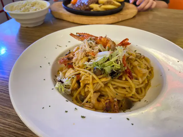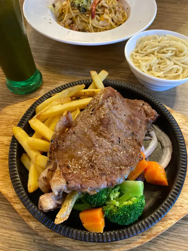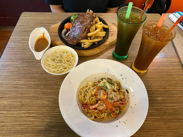 薯仔屋電影餐廳今次去左呢間餐廳食dinner😎叫左兩個餐同兩杯特飲!首先 我地叫左香煎虎蝦蟹肉龍蝦汁意粉碟意粉黎到既賣相好靚!蟹肉嘅份量唔少另外都仲有啲野菌😎意粉嘅份量適中 夠食☺️龍蝦汁既味道不濃不淡 岩岩好蝦都幾彈牙爽口另一個叫左鐵板黑椒汁肉眼扒配薯菜個肉眼扒肉質吾差都算滑嫩 多汁 幾厚身佢既黑椒汁我好鍾意😍好香d薯條炸到卜卜脆 點埋個汁完美兩杯特飲分別係 熱情果紅茶同青蘋果紅茶熱情果個杯既熱情果味重酸酸甜甜 加上熱辣辣嘅天氣飲番杯涼浸浸嘅嘢飲就啱啦至於青蘋果紅茶就會有啲甜怕甜可以試熱情果紅茶呢度嘅環境舒服 地方好大坐得都舒服啲 隔離又有戲院好方便晚餐都好多野食揀嫁!…Read More