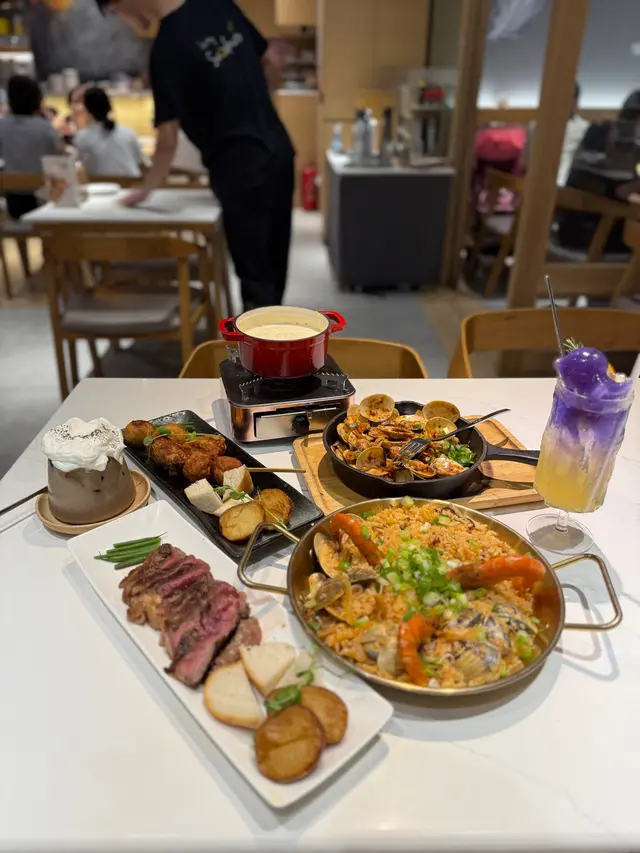 住喺將軍澳咁耐一直都冇機會去試,今次終於扚起心肝嚟啦!之前經過見到佢哋入邊有搖搖燈好想坐,但係今日去到好full所以已經冇晒了今次我嗌咗招牌菜:雪花芝士山鍋和西班牙海鮮泡菜飯同麻辣泡菜煮成斤重蜆雪花芝士山鍋尼道菜絕對係Seoulmate Cafe的視覺焦點!令人忍不住先拍照打卡除咗芝士鍋之外,仲有肉丸牛扒同埋麵包配搭芝士鍋超正!尤其佢哋個芝士火鍋,並唔係韓式嗰一種芝士係有少少似瑞士芝士火鍋嗰一種,所以食落去唔會咁漏~牛扒預先已經煮好,大概三成熟就咁食都得,兩個人share都已經好飽🤣西班牙海鮮泡菜飯尼道菜將韓國泡菜飯與西班牙海鮮飯的元素結合,創意十足。米飯炒得粒粒分明,帶有泡菜的酸辣和微微的炭香。特別值得一提的是,泡菜的酸辣味與海鮮的鮮甜完美平衡,既有韓式料理的濃烈風味,又帶點地中海的清新。份量亦都係比較多,適合4人享用麻辣泡菜煮成斤重蜆尼道菜是辣食愛好者的福音!餐廳用既係沙白,所以肉質更肥美,搭配韓式麻辣泡菜湯底,辣中帶酸,令人胃口大開。辣度適中,連不特別耐辣嘅朋友仔都可以接受。蜆肉煮得啱啱好,如果配一碗白飯更是絕配😆最後甜品嗌咗個蛋中的焦糖燉蛋,食落去好cream好滑,一個普通嘅燉蛋佢哋嘅造型都咁靚打卡一流!另外餐廳仲有好多打卡嘅飲品分別係北極熊系列同埋雪山奶蓋系列,冰極熊飲落去唔會好甜,雪山奶蓋就冇平時嗰啲飲品咁漏同埋佢哋係甜嘅奶蓋唔係鹹嘅奶蓋!…Read More