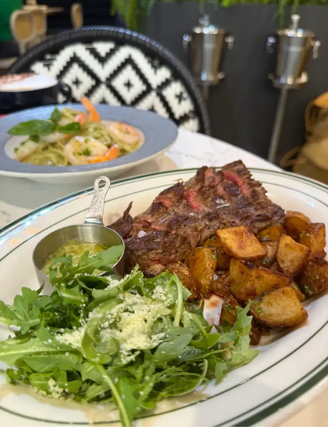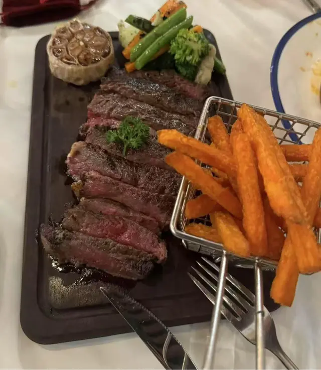 呢道白酒炒蜆簡直係鮮味爆棚!蜆肉又肥又嫩,白酒同蒜頭嘅香氣完全滲入去,每粒蜆都吸晒湯汁,啖啖鮮甜!湯汁仲可以用麵包蘸來食,保證舔碟都唔夠!3. 頂級肉眼扒配香烤大蒜及手工地瓜脆條