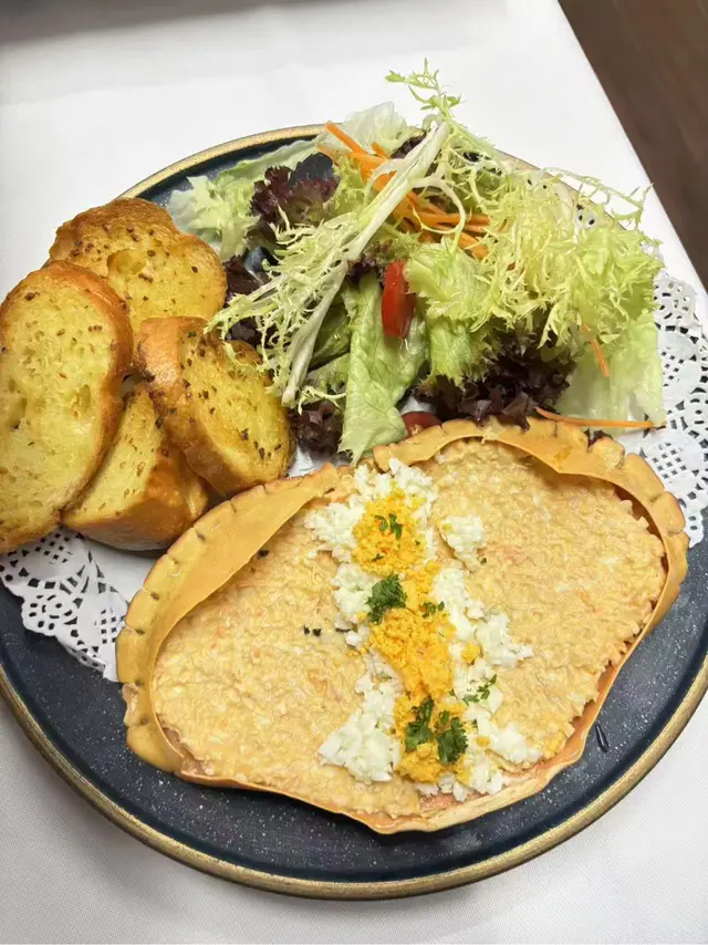 馬介休球係葡國菜經典,葡富軒整得真心正!外層炸得金黃香脆,裏面係軟綿綿的薯蓉同鹹香的馬介休,咬一口,濃濃的魚香同薯味爆出來,超滿足!一個接一個,停唔下來!3. 主廚特製蟹肉釀蟹蓋