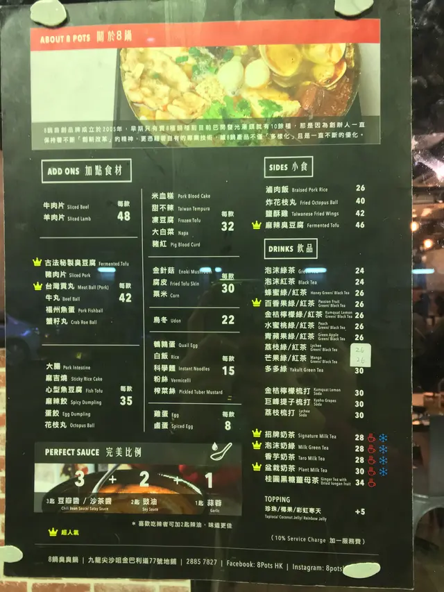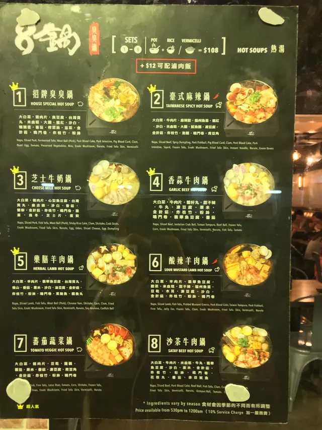 佢有8款鍋可以揀,每款鍋湯底同配料都唔同,所以要睇定menu好好揀定自己要邊款,好彩得8款,因為有選擇困難證真係要揀好耐