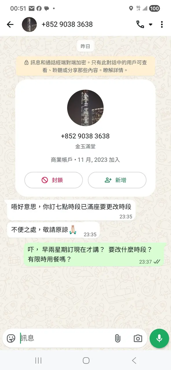 未食已經極度不滿 金玉滿堂 2025-11-28打算為朋友慶祝生日,咁我早兩星期在 Nov 14 訂了 Nov 28 - 7pm 枱, 點知佢 Nov 27, 晚上11:35pm 用Whatapps 通知我話 booking 已滿要我改時段, 我已經即時問佢嘢, 但一路無回覆😡哩啲咁嘅服務質數,有幾好食都無用,我都唔知點解會揀中佢慶祝生日, 哩一世都唔會幫襯哩間餐館…查看更多以上食評乃用戶個人意見 , 並不代表OpenRice之觀點。2分享未食已經極度不滿 金玉滿堂 https://s.openrice.com/QrLT0lcylW0檢舉 張貼 評分--味道3環境1服務3衛生--抵食慶祝紀念生日