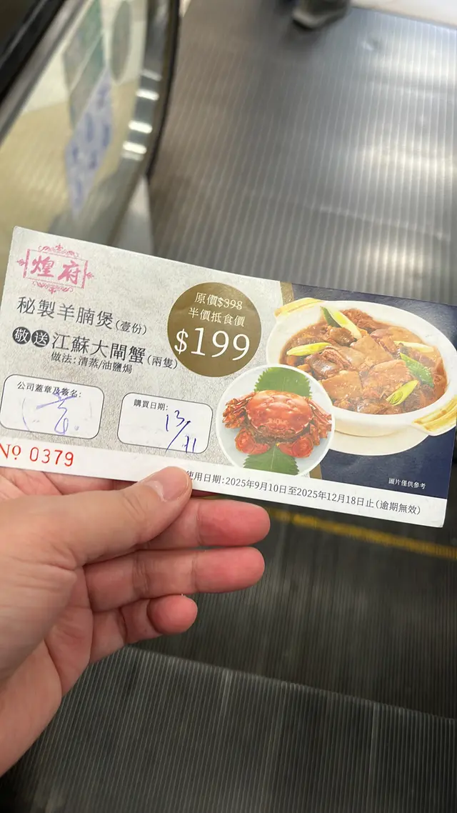 此店平時飲茶已常光顧,見到她們的宣傳單張有羊腩煲+ 大閘蟹餐券祗用$199,非常吸引,姑且找個晚上到此用膳一試。券不能即買即用的,記得要前天先買定。到店出示餐券,另下單加點餸菜便可以羊肉煲非常足料及大煲,有羊的多個部位,肉質嫩滑唔太騷,而冬菇、枝竹、筍及馬蹄亦好入味,真係食到😋,祗嫌配送的唐生菜不多,如果想追加配菜亦可,不過要盛惠$ 68😳後來上的大閘蟹,但無問我們煮法,應該是蒸呱!尺寸大小都可以,不過其中一隻超多泥巴,唯有用剪刀去開,如果落口咬真是會滿口泥土的😩。希望酒樓加工刷下蟹身乾淨才煮,不然會很倒胃。加點了酒樓的優惠餸菜: -鴨兩吃👍🏻片皮鴨$128 + 涼瓜鴨架$58鴨皮油潤卜卜脆,仲要超大塊,不過祗有青瓜配菜,大葱及酸羌欠奉,真的美中不足😔埋單4人不用$500(已計券$),餐後每人更有一碗熱紫米露送上,CP值可以,如果喜愛羊肉,此店絕對是入冬飯聚首選。👍🏻👍🏻👍🏻…查看更多