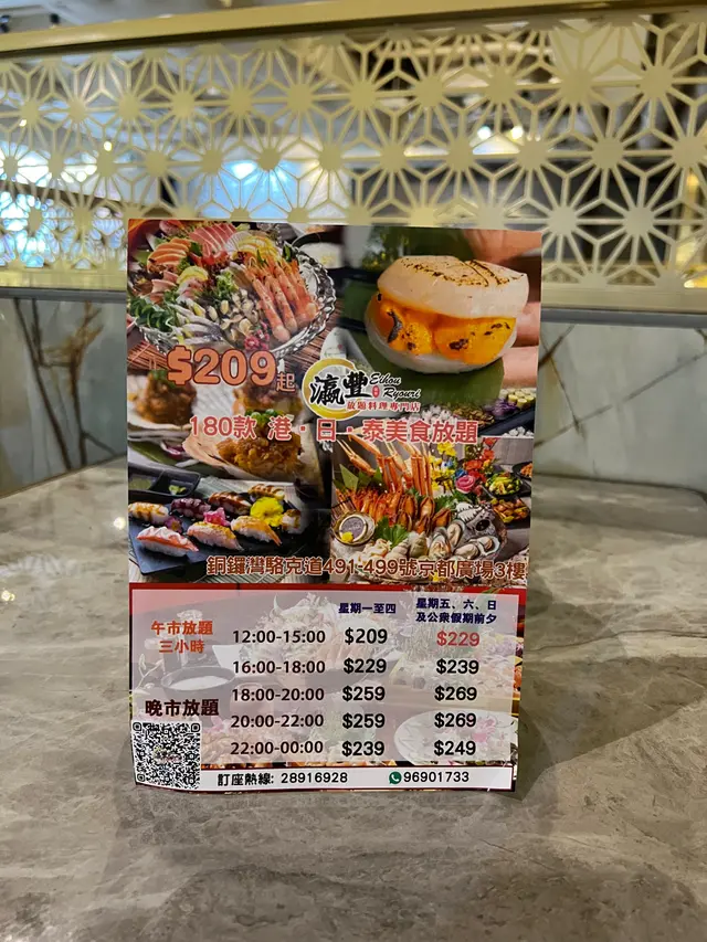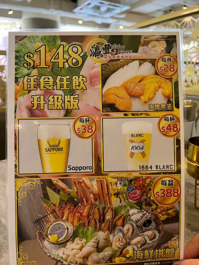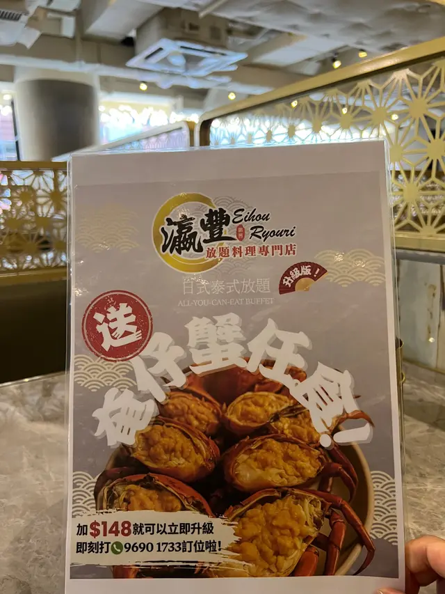 今日lunch 同朋友去咗瀛豐食放題,午市放題可以食3小時,由 12:00到15:00,價錢是$209。見到有奄仔蟹任食都係加$148 ,而且仲包埋升級海鮮拼盤。我同朋友都好鍾意食蟹,所以就加嚟試吓。升級咗之後,仲包咗帶子海膽,大大粒好鮮甜。之後上咗刺身拼盤同埋海鮮拼盤,兩個都大份有睇頭。食完呢三樣嘢都已經飽飽地,但重頭戲依家先至嚟,就係奄仔蟹。冇諗過放題有咁好嘅質素,即叫即蒸,上枱熱辣辣,好大隻,仲要好多膏。其實仲包咗生啤任飲,不過我哋兩個都唔飲啤酒,就冇叫。出邊自取嘅飲品都有好多款式。食完晒啲升級美食,就叫咗啲熱嘢同埋壽司,推介試吓佢個火炙左口魚裙邊,我自己認為好好食,同埋鍾意佢啲壽司飯細細粒,唔會話食到好飽。其實佢仲有好多泰式嘅食物,試咗炸魚餅同埋泰式鳳爪都唔錯。結論,如果鍾意食蟹一定要加錢升級任食奄仔蟹和海腦帶子,絕對回本。除咗食放題都見到其他客人食午市套餐,問咗侍應拎個餐牌嚟睇,原來又真係幾抵食,如果唔想食太飽,都可以試吓佢午市套餐。影埋個餐牌大家參考吓。…查看更多