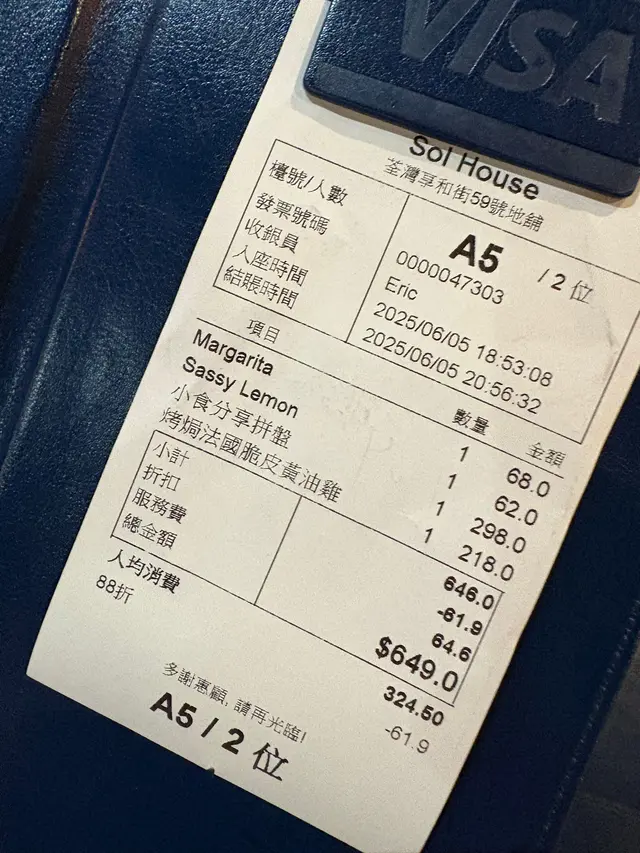 星期六晚,同女朋友喺荃灣行咗成日街,睇埋戲,攰攰哋,係時候搵個地方坐低,醫下個肚。我哋冇特別預約,就隨意行到嚟呢間Sol House,見佢門面裝修幾骨子,就決定入去試下。餐廳入面燈光柔和偏暗,黃黃哋嘅燈光打落木系嘅枱櫈度,營造出一種好舒服嘅感覺。😌 雖然係週末,但又唔會太嘈吵,每枱客人都係細細聲傾計,播住啲輕快嘅歐美流行曲,成個氣氛好放鬆,好適合兩個人慢慢食餐飯,傾下偈。👍🏻🤍小食分享拼盤 💋💋💋💋炸雞翼個皮脆到「咔嚓」聲,燒烤汁甜甜地好惹味;墨魚咀同魷魚圈彈牙得嚟唔韌,蟹肉波入面真係有一絲絲蟹肉🦀。最正係水牛芝士波,一咬爆漿,濃郁芝士香仲拉絲🧀!🤍 烤焗法國脆皮黃油雞配煙肉脆薯 💋💋💋💋💋主菜黃油雞一上枱,個賣相已經好吸引!😍 雞皮焗到金黃色,脆卜卜,一刀切落去仲有「咔嚓」聲!雞肉嫩滑多汁,完全唔嚡口,肉質好有彈性,證明隻雞嘅質素唔錯。雞油嘅香味滲透到每一吋雞肉,非常入味。旁邊嘅煙肉脆薯更加係畫龍點睛,薯仔吸收晒啲雞油精華,外脆內軟,超級惹味!🥔🤍 Margarita 💋💋💋💋我杯Margarita,杯邊嘅鹽霜做得好均勻,每一啖都飲到鹹、酸、甜嘅交織。龍舌蘭酒味夠突出,但青檸汁嘅酸甜平衡得啱啱好,唔會過酸或者過甜,飲落好清爽,好醒神。🍹🤍 Sassy Lemon 💋💋💋女朋友唔飲酒,點咗杯Sassy Lemon。呢杯嘢飲檸檬味夠清新,加埋梳打水,氣泡感十足,夠晒解渴。不過對佢嚟講甜度可以再輕手啲,飲到後段會覺得有少少偏甜。🍋呢餐由飲品到主菜水準都幾穩定,尤其係個黃油雞真係值得encore~雖然冇叫到生蠔,但見隔離枱開嘅蠔睇落幾肥美,下次可以試下🦪。兩個人食咁多嘢捧住個肚走,滿足度爆燈💡!…查看更多
