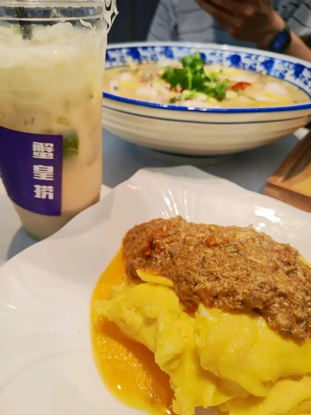 店鋪環境乾淨又唔怕坐得逼,有下次!極品蟹黃撈飯套餐蟹黃蛋牛雜煲酸菜魚香水檸檬茶…查看更多