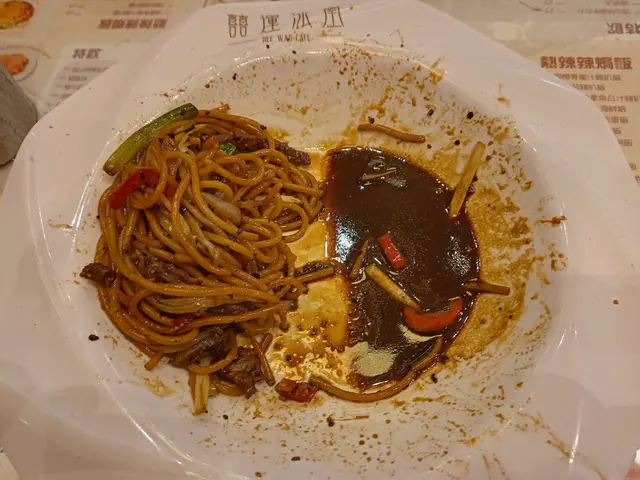 ,以為炒得唔均勻,嘗試撈勻睇下會唔會好啲,因為本人都珍惜食物,唔會隨便就退回,但係都係救唔到,唯有叫店員換,店員建議叫另外一樣。我就選擇咗黑椒牛柳絲炒意粉,黑椒牛柳絲炒意粉都唔係第一次食,都冇乜問題,但今次明顯深色好多,食落黑椒量都比平時多,不過我食得辣,對我嚟講都冇乜問題,但食到一半法發覺呢碟唔係炒意粉,係湯意粉,係豉油湯