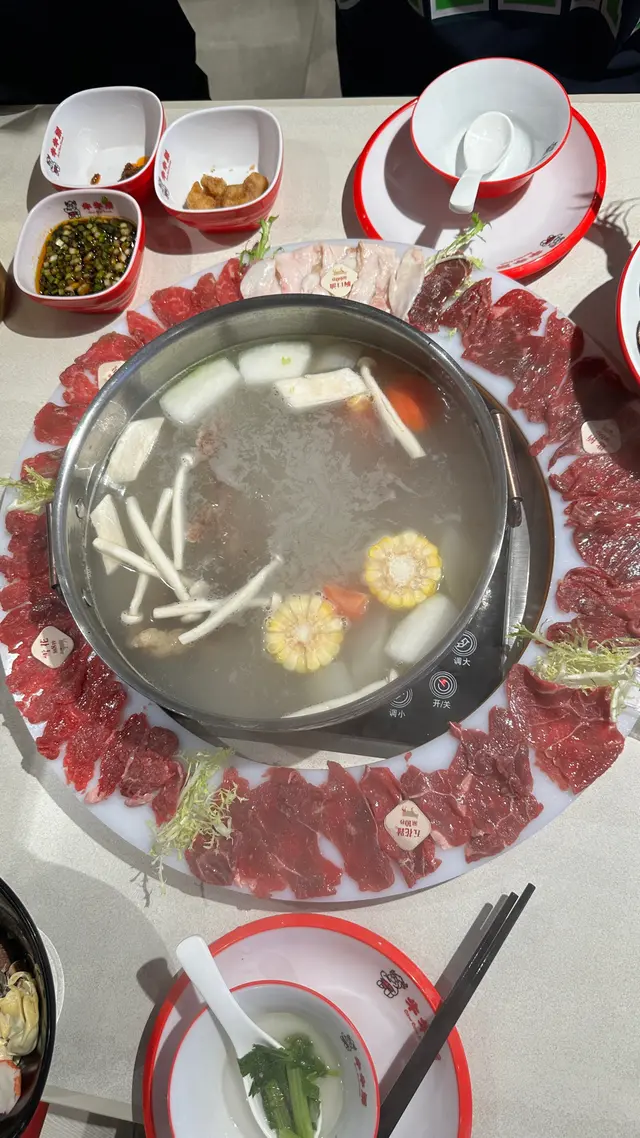 朋友鍾意食新鮮牛肉打邊爐,所以揀咗呢間!由潮汕師傅主理,喺用餐區可見到師傅即場手切牛肉,包括五花趾、吊龍、匙柄、雪花、牛胸油,第一round會每一款都上齊,個人鍾意食雪花位,肉質較鮮嫩!有8款湯底選擇,我揀咗招牌潮汕牛骨湯,入座會有海鮮拼盤,同場有多款任食火鍋配料,包括西班牙黑豚肉、紐西蘭青口、手工墨魚滑、鵝腸、手工咸蛋黃魚皮、潮汕南乳炸雞翼、椒鹽炸花枝丸及椒鹽墨魚丸,鹹蛋黃魚皮即炸脆卜卜,不會太鹹,打邊爐一流,仲有炸花枝丸好啱用嚟送啤酒酒或者汽水!自助區有各款手工小食、雪糕,以及紅酒、白酒、啤酒任飲