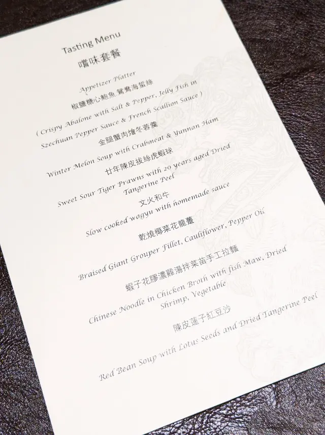唐述是一家以精緻中菜為主打的餐廳,結合傳統與創新,注重食材的選擇和烹調技巧,環境雅致舒適,適合各類聚會與宴請。嚐味套餐設計精巧,菜色豐富多樣,從海鮮到肉類、湯品和甜品,一應俱全,展現高水準的粵菜料理。套餐內容包括:· 雲南泡椒帶子:以帶子配上酸辣開胃的泡椒,開啟味蕾。· 前菜三弄:包括柑桔梅子番茄、陳香海蜇凍及20年古越龍山花雕生醃蝦,味道清新而層次豐富。 醉蝦浸20年花雕:蝦肉浸泡在陳年花雕酒中,香氣濃郁。· 蟹肉濃湯雪燕羹:以雪燕和蟹肉燉成濃湯,質感細膩。· 手工棉花玉掌孔:炸魚膠包裹鵝掌和菇類,外酥內嫩。· 珍寶珠(楊枝甘露雪葩):用以清口,讓味覺得到調節。· 遠年陳皮檸檬蒸生馬友:配搭柑橘味道的蒸魚片,清新爽口。· 藥膳鮮蠔黃酒雞:中藥香氣融入雞肉和蠔,滋補又美味。· 金湯雲吞:傳統雲吞配以金黃濃湯,暖胃滋味。· 桂圓紅棗奶凍:以桂圓和紅棗搭配奶凍,甜品口感圓潤香甜。整個套餐既保持粵菜的經典風味,亦融合創意元素,每一道菜餚都精緻細膩,令人回味無窮。唐述的這套嚐味套餐不論是食材搭配還是味道層次都非常講究,是體驗精緻中菜的理想之選。餐廳氛圍舒適優雅,讓用餐成為一場美好的享受.唐述是一家結合傳統與創新的中菜餐廳,注重食材品質和烹調技巧,營造出雅致舒適的用餐環境,適合各種聚會和商務宴請。…查看更多
