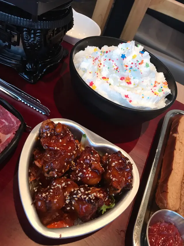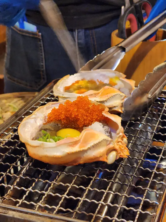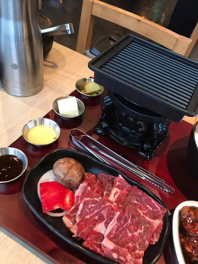 叫咗個燒肉Set C,$499,有牛有豬 (調味牛肋骨、牛五花、豬五花、豬頸肉),仲有一堆大豆芽、泡菜、茄子、芝士、腸仔。豬五花,燒到焦香,入口香脆,包埋泡菜、生菜食係一流。豬頸肉肉質爽口,味道適中。牛五花可以燒到咁上下攤出嚟燒,會快d熟。調味牛肋骨醃得好入味,味道較濃,建議最尾先食~醬油蟹加白飯,$198蟹肉蟹膏十分香滑,蟹蓋有隻生蛋,白飯上面鋪滿紫菜,3樣撈埋嚟食係一種享受~餐廳器皿都是金屬製,不是膠質野,較有質感,對我來說十分加分。…查看更多