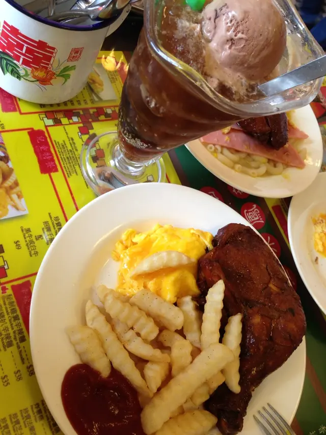咁大個人叫個兒童餐食,初時也許怕尷尬,但望下四圍唔少麻甩佬姐姐仔都食緊。說老實,呢個兒童餐從那一個角度適合兒童呢?一大隻豉油雞髀、炒蛋、炸薯條再加杯黑牛,份量之大,正常小朋友點食得哂。而且多肉零菜,卡路里爆燈。雞髀都夠入味,炒蛋也夠滑夠水準。港式快餐式的薯我一向麻麻,唔夠香脆。不過,呢個兒童餐都係俾我們大人,去緬懷一下小時拿著隻雞髀大啖咬的喜悅。…查看更多
