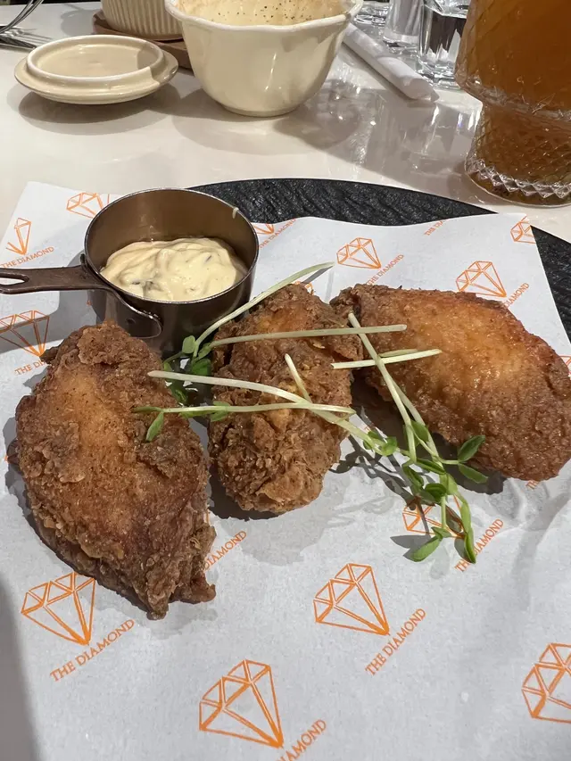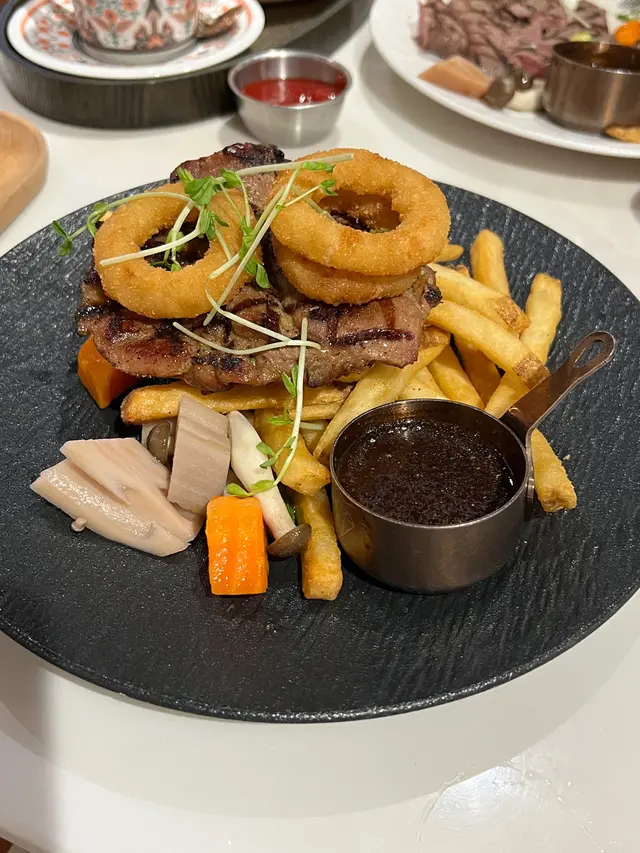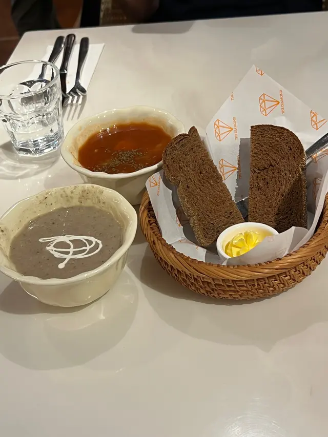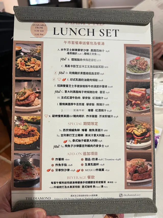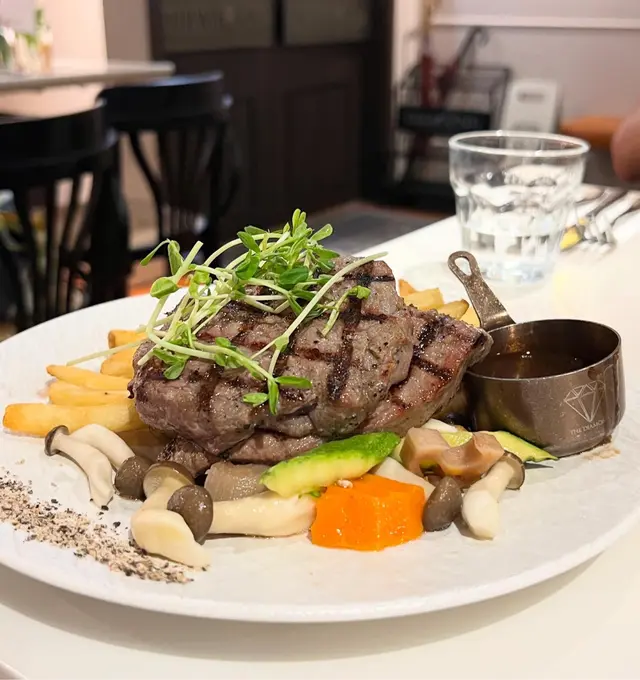 位於元朗的 THE DIAMOND RESTAURANT 人氣一直高企,午市時段經常座無虛席。餐廳裝潢主打簡約歐陸風格,空間感十足,座位寬敞舒適,是區內難得的休閒用餐之選。今次品嚐了他們的午市套餐($88-$148),包主菜、餐湯、麵包及飲品。以這個地段和質素來說,CP 值極高!🥣 是日湯品•紅湯(羅宋湯): 酸甜度平衡得宜,番茄味濃郁開胃,足料好飲。•白湯(蘑菇湯): 質地幼滑濃郁,菇菌香氣撲鼻,表面更有精緻的奶泡拉花,誠意十足。🍽️ 主菜推介•K. 炭烤慢煮美國IBP 豬肉眼扒配炸洋蔥圈・芥末籽燒汁豬肉眼採用厚切處理,表面烤得焦香誘人。肉質 Juicy 且富有嚼勁,肉汁鎖得很好。伴碟的炸洋蔥圈酥脆不油膩,加上薯條、雜菜及蘑菇等豐富配菜,份量相當有驚喜。•J. 炭燒牛柳配燴薯・紅酒燒汁同樣是厚切牛柳,炭火香氣非常突出。點了五成熟,火候控制精準,切開肉質粉嫩軟滑。醬汁別出心裁,紅酒燒汁帶微甜,與牛柳配合得天衣無縫。✨ 加配小食及甜品•Mexico 雞翼(3隻): 隻隻份量十足,外皮炸至金黃香脆,內裡肉質嫩滑,幾十蚊加配非常抵食!•生果乳酪杯: 希臘乳酪口感滑溜,酸甜清新,面層鋪滿果乾,既健康又解膩。•Tiramisu: 咖啡酒香濃郁,綿密順滑,蛋糕濕潤度與甜度都拿捏得剛剛好,必試之選。🍹 特色飲品•寶石水果茶(冷): 超大杯!滿滿的新鮮水果切片,茶底清香不澀,既好喝又適合打卡。•檸檬香茅薑蜜(熱): 暖胃醒神,天氣轉涼時飲用最適合不過。📝 總結午市套餐有湯、麵包、飲品,主菜份量與質素絕對對得住價錢,加配的小食和甜品性價比亦高。加上員工服務親切、上菜效率快,環境舒適愜意,難怪長期深受食客歡迎,值得回訪!…查看更多