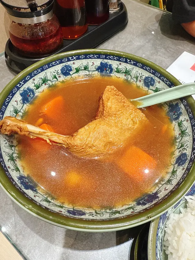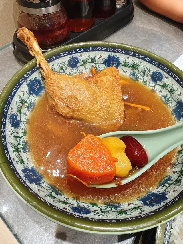 今次嚟海之戀見到呢間九爺牛腩,幾有驚喜!首先個蟲草花鴨腿湯飯,鴨腿燉到冧晒一撕就開,蟲草花湯底清甜唔油膩,撈飯食簡直一流,秋冬食肯定仲正!麻辣牛腩牛筋撈粗麵係重口味之選,牛腩半肥瘦啱啱好,牛筋膠質爆燈,麻辣汁唔會死辣係香辣嗰種,撈勻粗麵掛汁力滿分,食到嘴唇麻痺先過瘾!另外叫咗碗淨魚蛋雲吞,魚蛋彈牙唔會粉咗咗,雲吞皮薄餡足,蝦肉豬肉比例啱啱好。飲品必點紅豆冰,紅豆煲到起沙但又保持到粒粒口感,淡奶甜度適中,解辣又解膩。整體分量足,價錢合理,海之戀商場環境舒服,一定會再encore!…Read More