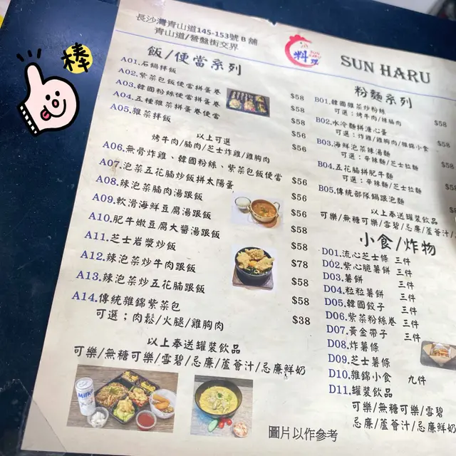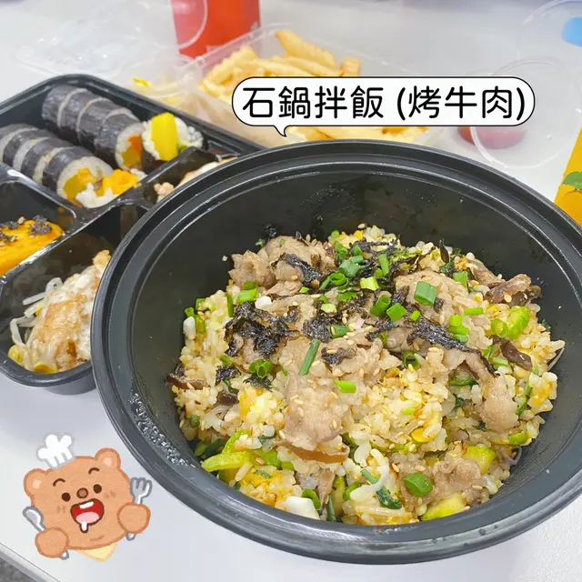 由於好耐都無食韓國野,今日見到呢間新開張既韓國料理 – SUN HARU,二話不說今日lunch就決定揀你啦! 店名: SUN HARU (長沙灣)地點: 長沙灣青山道145-153號安寧大廈地下B號舖呢間韓國料理上網睇返,原來佢都有其他分店既,而長沙灣呢間應該係新外賣分店佢價錢都非常親民!50幾蚊已經有套餐跟罐裝飲品。今次我地揀左 2個套餐,分別係 A02 紫菜包飯便當拼蛋卷 (芝士炸雞) + A01 石鍋拌飯 (烤牛肉)A02 紫菜包飯便當拼蛋卷 (芝士炸雞) $58 配可樂呢份便當又有紫菜包飯,又有蛋卷,又可以揀多款肉 (烤牛肉 / 腩肉 / 芝士炸雞 / 雞胸肉),仲要有D配菜,岩曬咩都想試下但又食量5多既我!紫菜包飯有好香既香油味,但又5會覺得好油!而蛋卷係有一絲絲既甜味,重點又5會好甜果種!重點推介蛋卷!而個芝士炸雞我外賣返去都仲係好脆!肉質絕對5會炸到好乾身!配埋芝士醬好香啊~~~ 滿足!A01 石鍋拌飯 (烤牛肉) $58 配芒果汁呢份石鍋拌飯勁抵食,個份量超大份,配料都有好多種,好colourful!賣相極為吸引!有翠玉瓜,木耳,菠菜,芽菜等等,佢可以揀一款肉類 (烤牛肉 / 腩肉 / 芝士炸雞 / 雞胸肉),然後淋上佢地既韓式拌飯醬汁,聞落真心好香!啖啖都好滿足!炸薯條 $25薯條炸得好香脆,唔會太軟身,亦都唔會炸得太耐!份量都好大份添