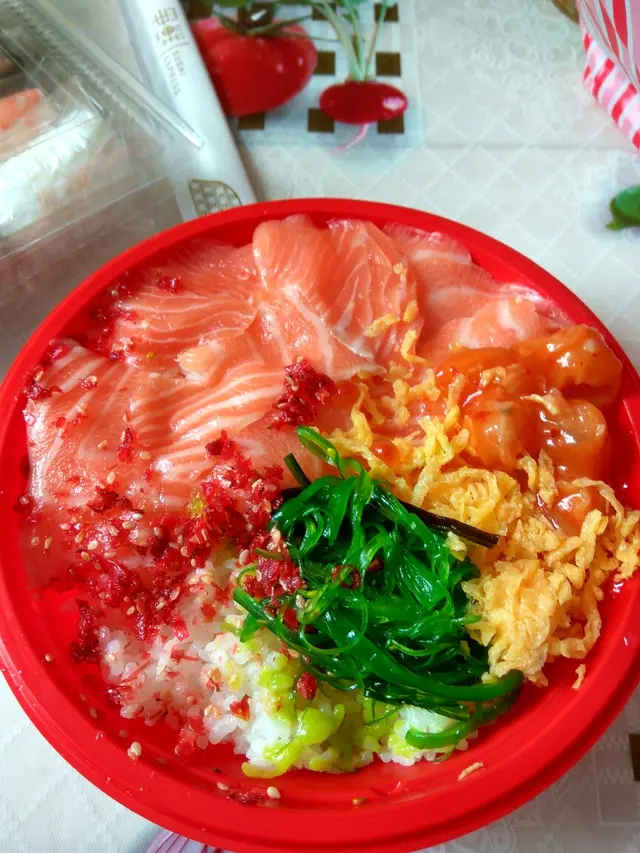 三文魚丼飯 爭鮮外帶壽司 (港鐵天水圍站) 2016-07-05是日小朋友又話要食壽司,但小妹因連續幾日都係食壽司已經開始厭,見佢尐飯都幾吸引,於是乎買左個三文魚丼飯俾自己。三文魚丼外表新鮮吸引(相中個丼飯俾小妹唔小心跌過落地,所以有少許走樣)除左有主角三文魚外,仲有蒜味螺肉、蛋絲、中華沙律、櫻花蝦作配角。三文魚睇樣雖然肥美,但略嫌魚油香味不足;而且係非一般的薄切,丼飯睇上黎細細份,小妹亦唔算係細食之人,但呢個丼飯已經可以令小好飽肚…查看更多以上食记乃用户个人意见 , 并不代表OpenRice之观点。1分享三文魚丼飯 爭鮮外帶壽司 (港鐵天水圍站) https://s.openrice.com/QrLT0lzIJW0检举 张贴 评分3味道3环境3服务3卫生3抵食用餐途径外卖自取相关食记30日内同一位会员在同一间餐厅提交的食记都係堂食勝一籌