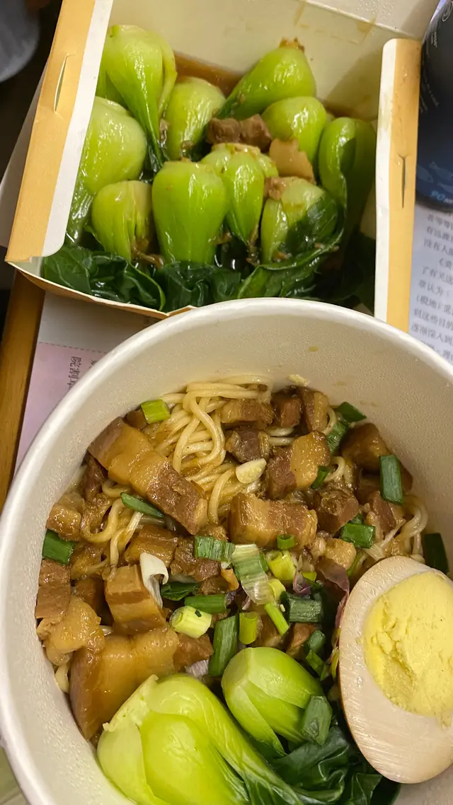外賣點的這家,週末也還可以配送。肉臊麵加上海青蔬菜。肉臊味道是很香,但是外賣送來的面都會有點坨…..總體來說味道還是不錯的奶茶無糖就可,而且送貨速度巨快!!!可能就剛好在家附近吧hhhh…查看更多