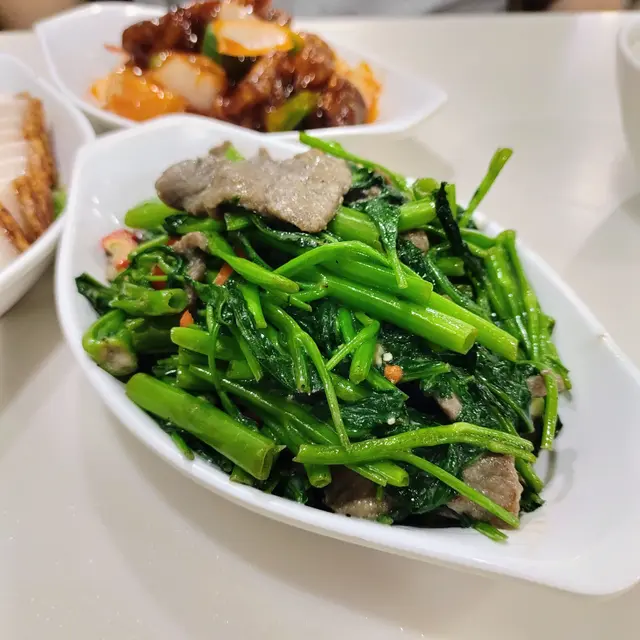 呢間大王係觀塘區都有左好多年,堂食比較少黎因為晏晝太難搵位,但外賣就成日叫啦。四十幾蚊起真係好親民,份量唔少味道又唔錯,係唔少打工仔嘅飯堂😆是晚七點幾黎到食下堂食小菜,店內雖然仲有好多枱,但卡位全部坐滿,好好彩霸到最後一卡😝⭐例湯是晚例湯係合掌瓜,清清地無果精,飲返碗確實唔錯。⭐叉燒燒肉雙併點左份燒味叉燒併燒肉,叉燒軟嫩燒肉半肥瘦,層皮仲好脆㗎,好食喎。⭐菠蘿生炒骨個汁酸酸甜甜調得啱口味,排骨香脆有口感,配料有青紅椒、洋蔥、菠蘿等,好睇又好食😋⭐椒絲腐乳通菜炒牛肉通菜炒得翠綠爽口,腐乳汁鹹香鮮味,牛肉軟嫩,呢味勁好下飯。⭐椒鹽豆腐鮮魷有少少失望嘅椒鹽豆腐鮮魷,炸得燶左少少同偏油,但個椒鹽味夠香口,其實味道都唔錯㗎😋⭐白飯點小菜送白飯,大大碗夠晒飽。⭐凍檸茶再整返杯凍檸茶解解膩啱晒👍🏻其實茶仔出餐快、份量大、味道唔差就足夠,大王價錢咁親民直頭加分添啦,支持小店😊…查看更多