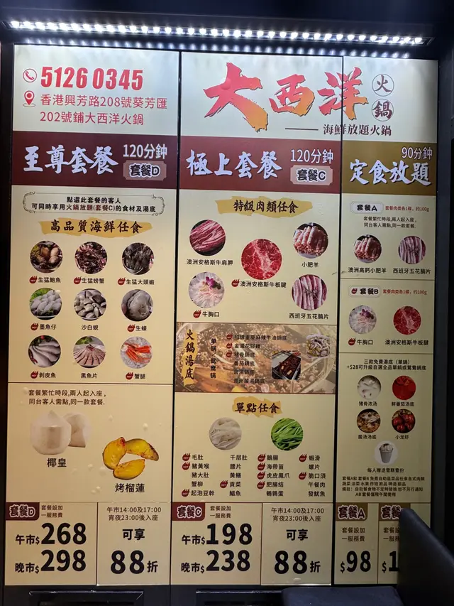 葵芳的 #大西洋火鍋 ,以即撈海鮮和超高性價比作主打,餐廳最大的亮點在於「即撈海鮮」和「榴槤放題」。🦀 即撈海鮮體驗:海鮮區設有魚缸,食客可以親自用桶和網撈取生猛海鮮,過程好玩又有儀式感。大頭蝦:非常生猛,肉質結實彈牙,而且很多都有豐富的蝦膏,鮮味十足。蟹:主要提供三點蟹或花蟹,雖然體型不算巨大,但肉質鮮甜實肉。扇貝與沙白蜆:貝類整體表現不錯,扇貝厚肉,蜆肉肥美,吐沙也處理得乾淨。🍲 火鍋三要素1. 湯底 提供多款湯底,包括金湯花膠雞、重慶麻辣牛油鍋、菌湯鍋等。推薦金湯花膠雞,湯底濃郁,真材實料有花膠,涮海鮮前喝一碗非常舒服。2. 肉類與火鍋配料 · 肉類:通過QR Code下單,推薦澳洲M5和牛及美國牛肩胛,油花分布均勻,牛味濃郁。 · 特色配料:值得一試的有蝦滑(彈牙爽口)、鵝腸(處理得乾淨,口感爽脆)和黑毛肚。 · 自助區:提供各式蔬菜、丸類、菌菇等常規火鍋配料,選擇豐富。3. 熟食與其他 · 熟食區:有蒜蓉焗生蠔、小龍蝦、炸物和串燒等。蒜蓉燒蠔肥美多汁,是等湯滾時的好選擇。 · 生果與甜品:除了王牌榴槤,還有即開椰青🥥,清甜解膩。另有西瓜、哈密瓜等時令水果以及雪糕雪條作飯後甜品。💯 性價比總結綜合來說,以每位晚市$298(價格或有變動,請以餐廳為準)左右的價錢,能任食如此多款質素不錯的即撈海鮮、安格斯級數的牛肉,再加上市場價不菲的任食烤榴槤和椰青,性價比非常高,絕對是「回本率極高」之選。…查看更多