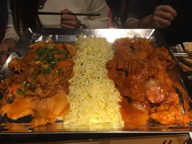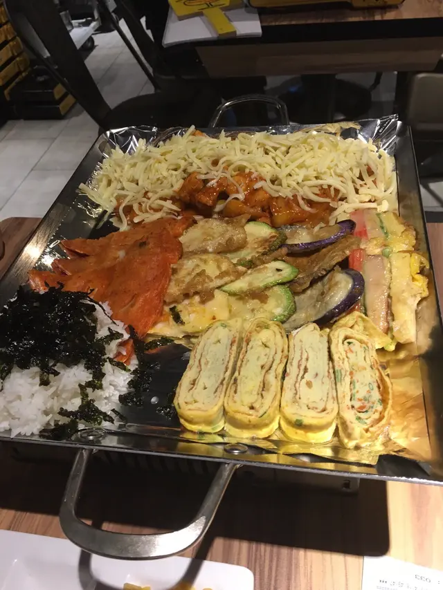 有蛋卷, 紫菜飯, 雞肉, 翠玉瓜, 茄子, 蟹柳, 菇...仲有d唔知咩黎好豐富 =] 仲正當然係d芝士, 即時自己決定整到佢有幾溶係唔錯!韓國野黎講, 覺得呢間都唔算辣@@岩晒我d唔太食辣既人~我地3個人食, 食呢個唔算好夠, 所以再追加多一盤呢個就係雞+豬, 中間同樣地一大埋芝士, 哈哈, 我覺得可以再多dd豬肉太碎了, 其實都唔係好搵到係邊味道方面, 其實無咩特別, 但每盤野下面都要有一個爐實在太霸佔地方自己個碟都無位擺啦~~~!…查看更多