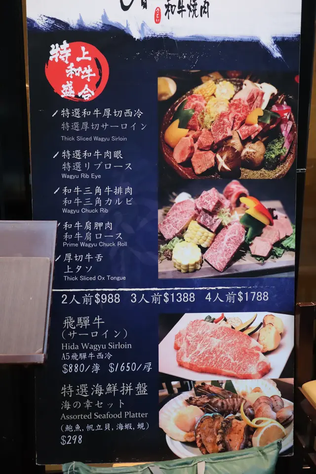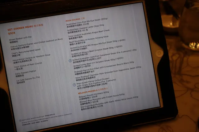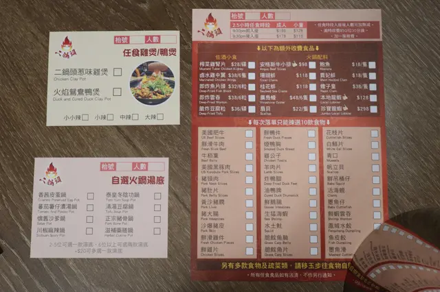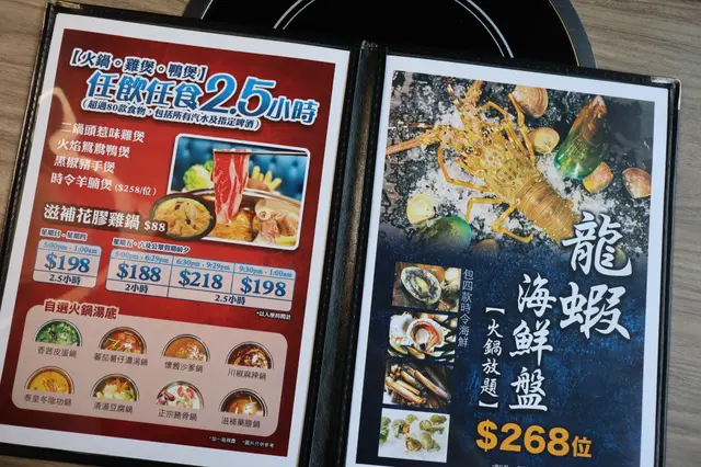 呢度嘅套餐分三款,基本「美國肥牛任食」,另外有一款係「牛魔皇美國極黑和牛任食」,最後一款係包咗每位四款時令海鮮嘅套餐。價錢方面分別係$198 (星期日至四5pm-1am) 任食2.5小時/$298 (尖沙咀限定;極黑和牛)/ $258 (海鮮)坐低之後,店員都會同客人介紹同解釋,明碼實價。喺兩個半鐘入面,客人可以首先任食雞煲/鴛鴦鴨煲或者黑椒豬手煲,無限refill,又可以轉款,好彈性,食到夠先停手,一定滿足