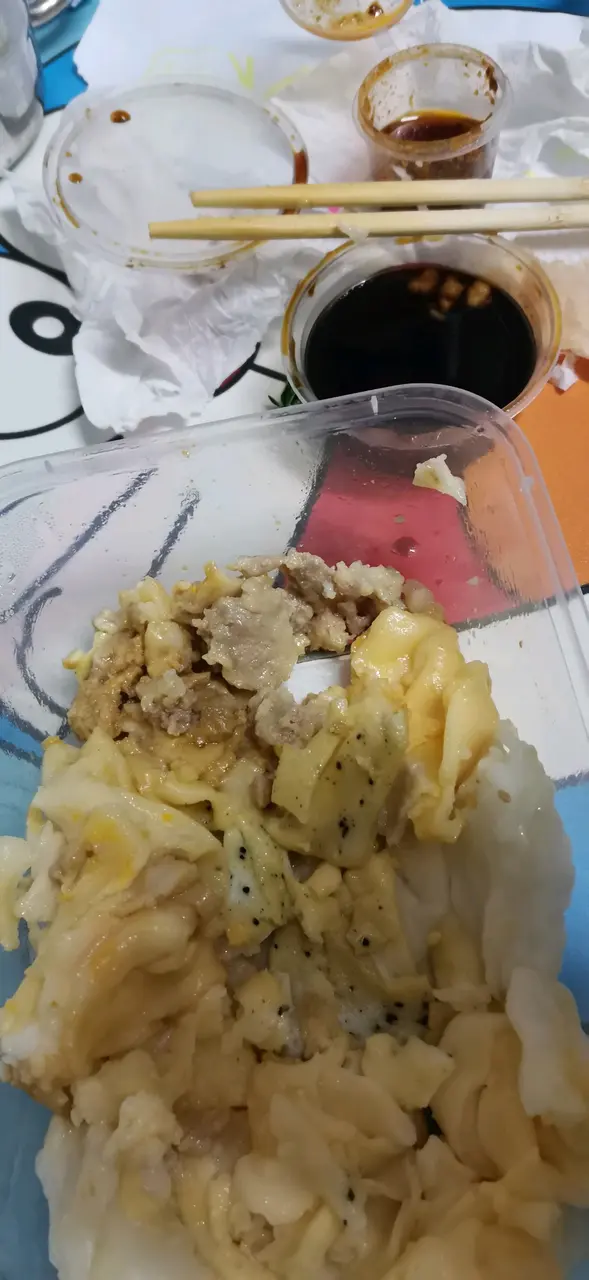 去到元朗又新街食嘢, 呢條街好多嘢食,,,喺街度賣菜轉入去街道內,無意中見到呢間腸粉店,,, 小妹我即刻眼睛發光,,,因 本人太喜歡食櫃桶腸粉了,,, 但實在太飽啦,,, 但係我都忍唔住買咗呢一盒瘦肉雞蛋腸粉$22紋返屋企夜晚食,,, 懷住期待既心情食,,,點之 一打開個盒呢都有少少異味道, 但本小妹實在太期待食啦(同唔想浪費), 忍唔住就試咗食, 係啲瘦肉有少少縮味,, 諗住挑開啲肉啦就可以食, 淨食雞蛋腸粉都可以食落口,, 但點知食到三分一左右,,, 竟然見到啲腸粉一點點黑色