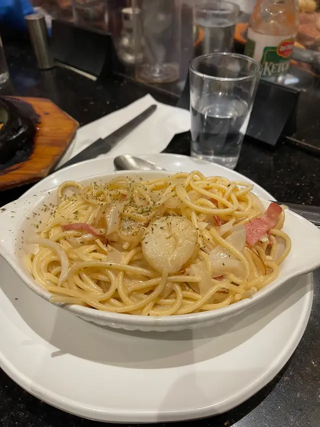 因為聽到人哋話呢一間抵食又好食所以嚟試 朋友就叫牛 我就叫咗意粉 由於想食海鮮意粉不過冇海鮮意粉剩係得卡邦尼帶子意粉 $88都試吓啦 雖然呢度出名唔係食意粉 不過嚟到嘅時候只係得兩粒細帶子..... $88只係得兩粒細帶子加意粉 仲要+1喎唔好忘記🙁 味道亦都鹹咗啲 都係冇下次啦😅而且通風不足夠地方又細 個個都食牛 然後係咁炸煙 煙燻眼情況都比較嚴重 因為左右前後都會係咁煙燻 全場煙霧彌漫咁🫠不過朋友就話啲牛幾好食 建議如果可以搬大啲或者 啲枱太迫啦 如果可以分開少少就好啲 同埋多幾粒帶子啦! 😅…查看更多