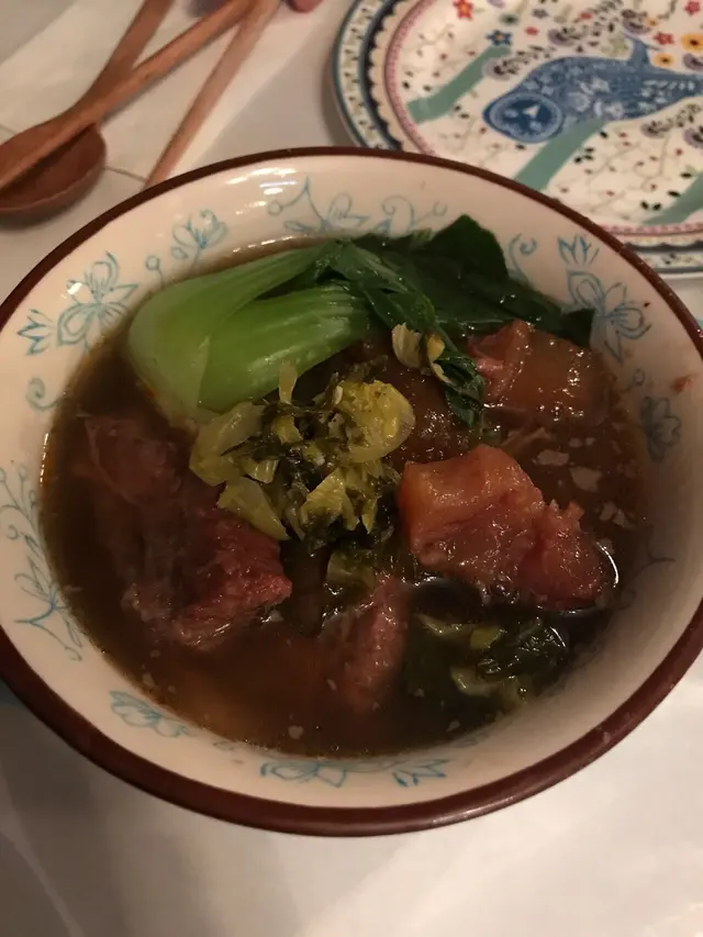 仲有可愛嘅筷子同匙羹我同朋友A點咗3樣嘢+2杯嘢飲紅燒牛肉麵上先份量十分細,一個人食一定唔飽朋友A覺得牛肉湯底味道較淡,但我覺得岩岩好,不算濃味,但亦都未到無味牛筋好淋好好食,但牛肉相較遜色,唔夠淋得黎有點兒鞋,麵的口感彈牙,味道黎講我會俾3/5分,岩岩合格,抵食就一定唔抵食架啦都有擔心唔夠飽,所以專登叫咗個炒飯蒼蠅頭炒飯我見識短,第一次睇到豆豉嘅別名係蒼蠅,覺得好生動