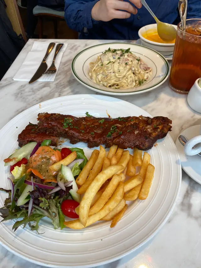 LUNCH SET有餐湯+主菜+飲品+甜品性價比高~食到好飽😋BBQ RIBS & 卡邦尼意粉:味道不錯,卡邦尼意粉喜出望外的好食,d汁好重煙肉味,唔會太膩~RIBS好大份~薯條非常好食~好脆👍🏻最驚喜既係我經openrice book枱既時候備註生日,店員真係有記在心上,送甜品來既時候加左蠟蠋同現場播生日歌~好有心呀🥰餐廳環境唔錯~主要係外國人幫襯~對香港人店員都好熱情招待我地~服務態度幾好😃下次有空會再來!…查看更多