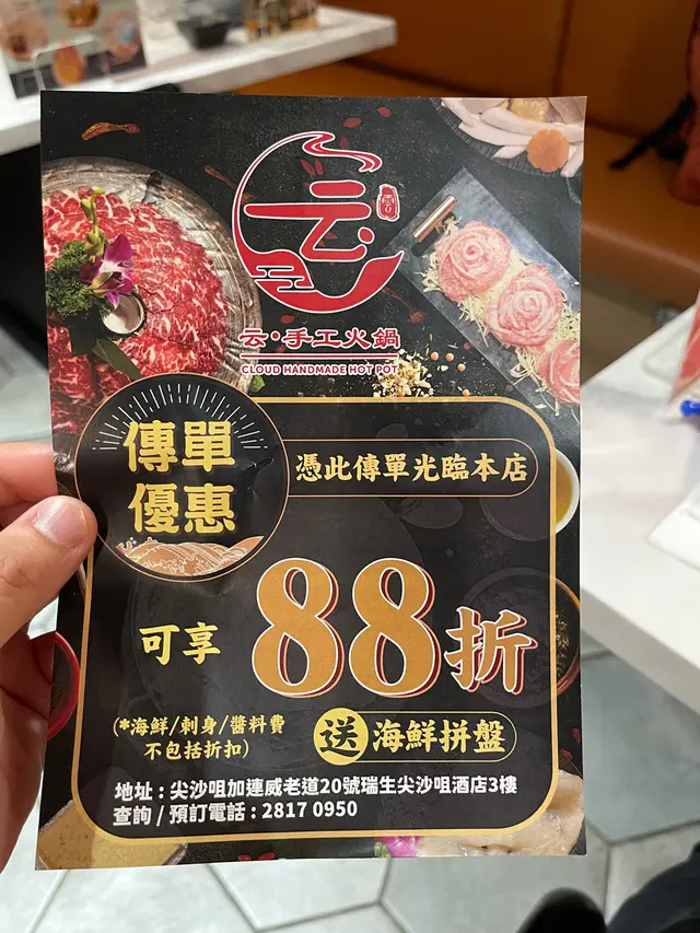 經過尖沙咀,想食火鍋,剛好路經派宣傳單張,88折優惠兼且有海鮮拼盤送,一於就去試試。火鍋店在酒店樓上,門口唔太顯眼,不過進入餐廳都算寧靜舒服,絕對可以三五知己圍爐取暖,亦都適合一大班朋友相聚傾計,預早book 更可以有VIP 房間包廂。食物質素唔錯,食材都算高質,芫荽皮蛋鍋,非常多芫荽,簡直係芫荽控嘅摯愛,湯底香濃而唔多味精,首先可以飲湯底。炸魚皮非常新鮮,新鮮即炸,令魚皮非常脆口,稍為少見。鵝腸新鮮,而且唔會有臭味。手切牛拼盤更可多品嚐唔同部位的牛肉。絕對必食。海鮮拼盤雖然送的,但質素唔差,海鮮都非常新鮮。…查看更多
