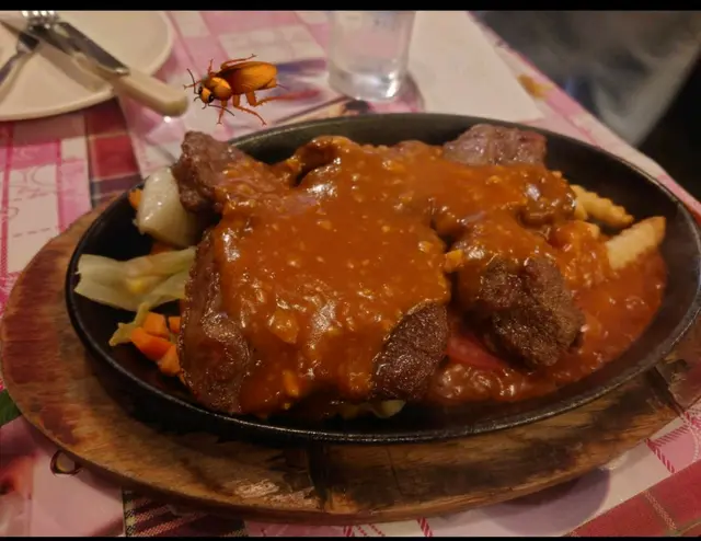 今日中午去食個肉眼扒,份量係大, 但食落口就無肉味,亦俾梳打粉𢲡到鬆泡泡, 所以乏善足陳。 最驚喜嘅係,食食下頭頂突然有陣風,跟住“撻”一聲, 嘩! 手指公咁大嘅曱甴跌左落枱面(如以下示意圖),我當堂嘩左一聲,個女仕應望過嚟呆左兩秒,跟住個男仕應講左句:“咦,邊度走出嚟?”跟住就一手用紙巾執走左,然後當無件事發生,期間完全無道歉、慰問或補償, 最尾仲要照舊收足埋我加一,真係香港食咁耐嘢最差嘅一次體驗,呢啲老字號餐廳真係要好好改善衞生同妥善應對呢啲突發事情,今次遭遇感覺真係太差大家話報唔報食環好?…查看更多
