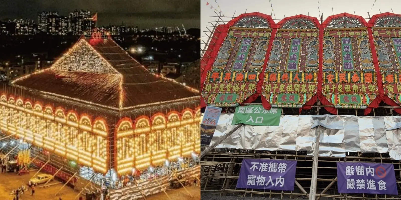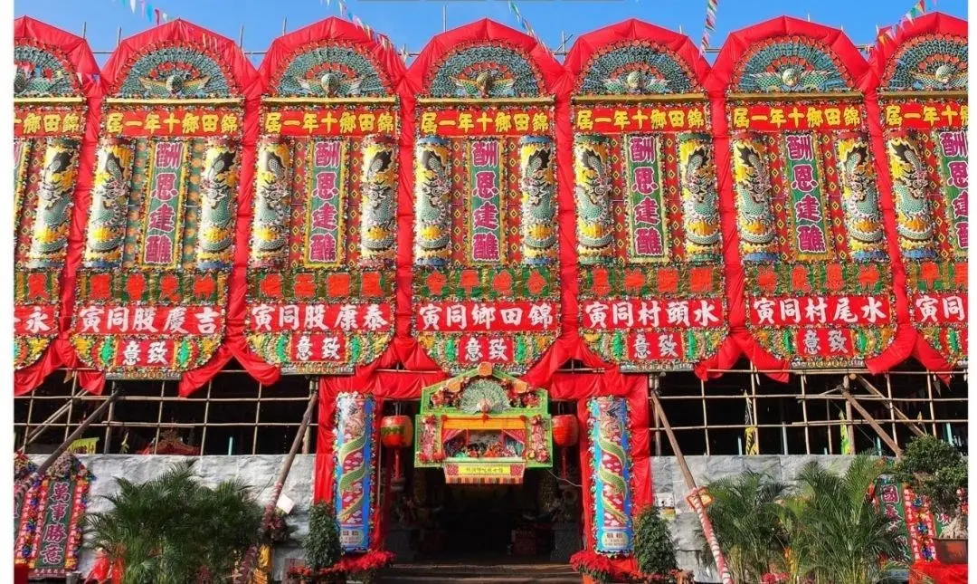 講到錦田打醮嘉年華最矚目嘅焦點,一定係已獲《健力士世界紀錄》認證為「全球最大臨時竹構祭壇」嘅巨型大戲棚!酬恩演戲(神功戲)每日日夜各一場,每場大概有1000張免費門票,暫定喺每場開鑼前約一小時喺非遺展覧館旁派發。要留意返,大家需先領有公眾席門票,並由指定入口進入戲棚呀~