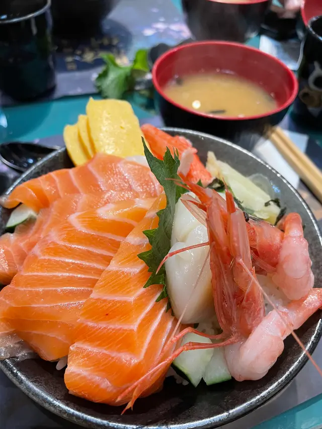 經過餐廳無數次, 今天終於嘗試了, 現在才發現原來餐廳有幾間分店。餐廳內雖然不大, 上下總共兩層, 牆邊牆紙用了日本風味的畫代替, 感覺也不錯。三文魚帶子甜蝦丼 $88午市定食, 除了丼飯外還有壽司拼盤選擇, 所有定食都配茶碗蒸, 沙律, 面鼓湯和紙包飲品。 丼飯當然是用珍珠米, 加上適量的醋, 甜甜酸酸的, 就算沒有配料單純吃飯也十分滿足! 😋 丼飯配料其實不少, 不過飯量更多 😅 三文魚非常肥美, 帶子甜蝦都新鮮, 毫無雪味眼看其他人點了壽司拼盤, 壽司也相當大件, 也不失為丼飯外的另一個選擇。 茶碗蒸蛋味雖濃但不夠滑, 裡面有菇, 蟹柳和紅板魚蛋。整體不錯, 尤其喜歡醋飯, 唯獨餐廳比較狹窄。…查看更多