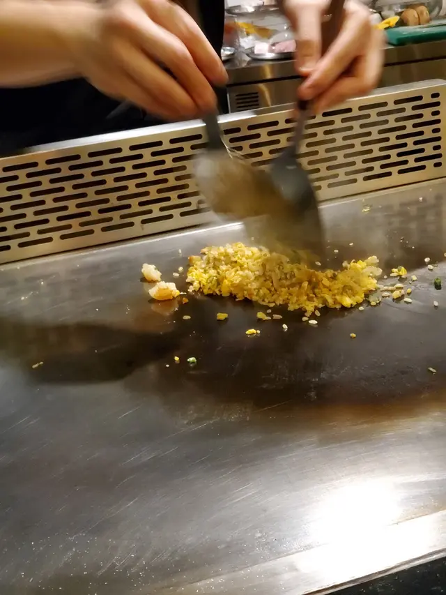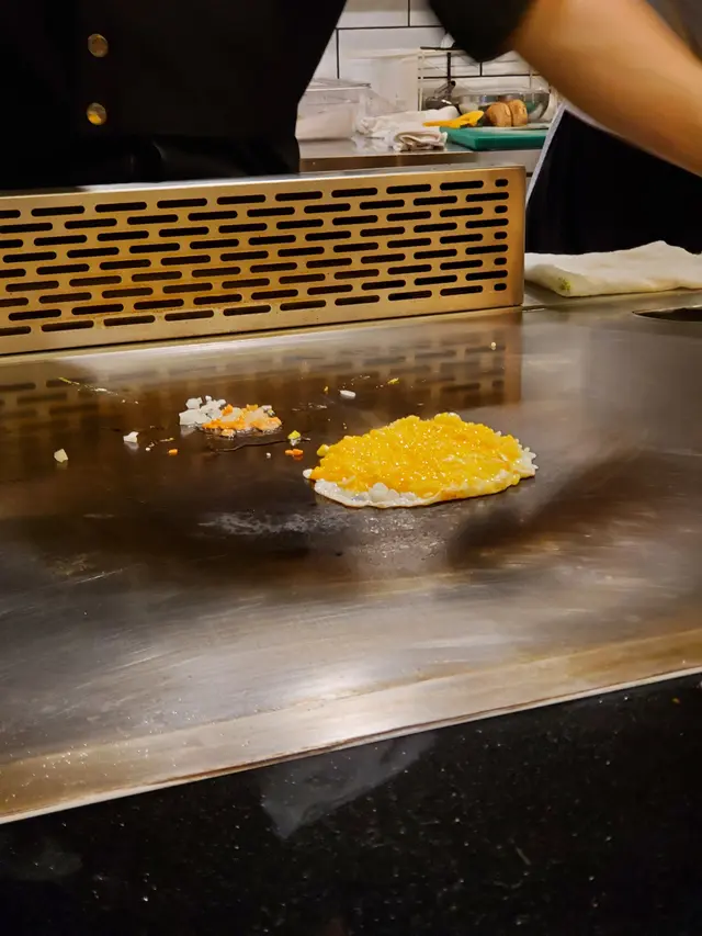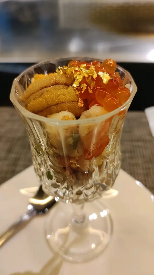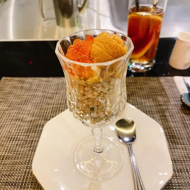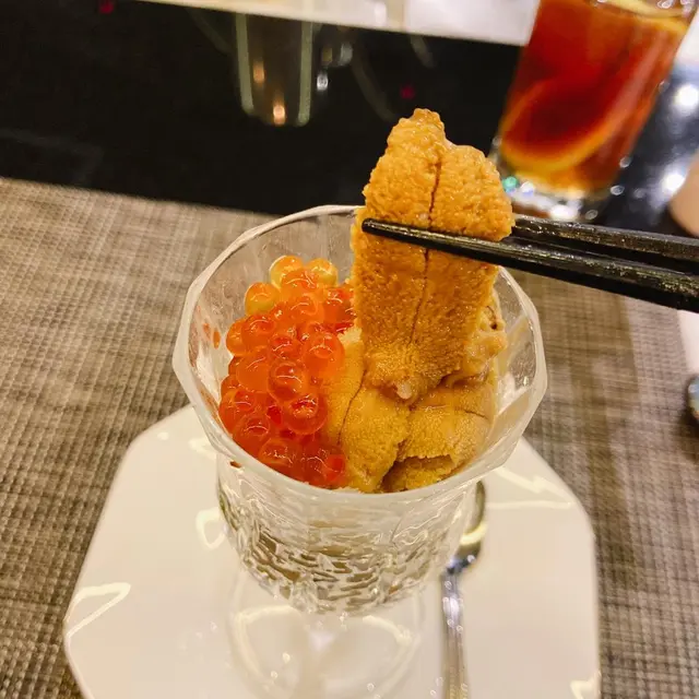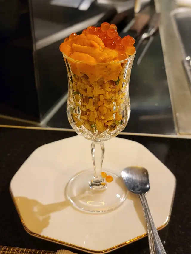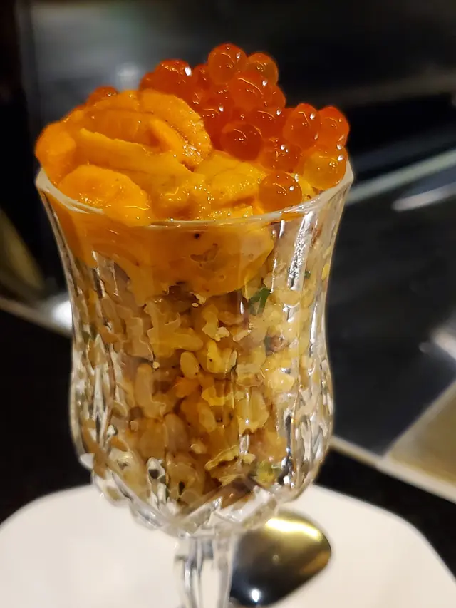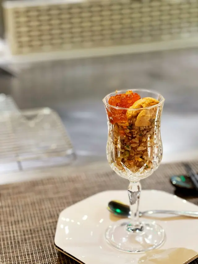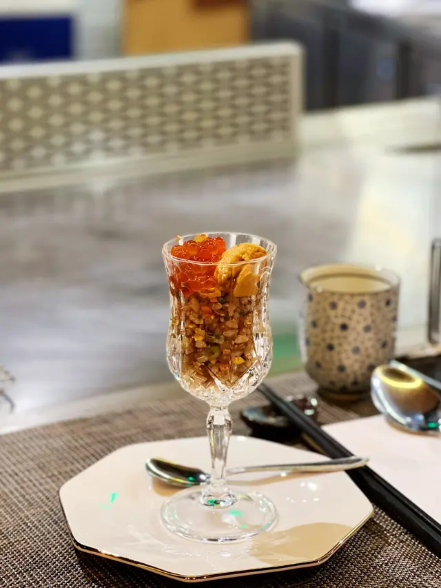 三文魚籽海膽炒飯,用上細小的玻璃杯盛載著很別緻,裡面有三文魚籽,海膽和一些海鮮,炒飯炒得很乾身,加上魚籽的海水味和海膽的鮮味,簡直是人間美食!