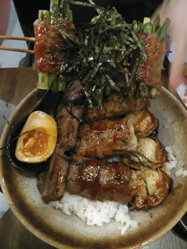 之前係同男朋友一齊食宵夜既愛店, 大牌餐牌款式好多, 啲相張張都影得好好食, 烏冬同串燒都係而度既主打, 估唔到午市更抵食, 同比起晚市少人啲。自家製鮮蕃茄濃湯烏冬 (西班牙豚肉) $60我每次必叫, 蕃茄味濃, 調味剛剛好, 食完係唔會(確)口個種, 而且因為濃湯, 所以掛湯力強, 烏冬似係手打烏冬, 微煙韧, 口感唔錯, 豚肉就不過不失, 4片左右, 厚薄適中, 唔老。串燒丼飯 (選4種, 日式和風汁) $59鹽燒特級牛舌 (+5), 韓醬燒蒜芯豬腩卷, 汁燒北海道元貝 (4粒, +5), 汁燒金菇牛肉卷好好食, 一上台都幾震撼, 啲串燒逼爆個碗, 和風汁同丼飯幾夾, 唔會死咸, 另外都會有一小碗放側邊, 方便去點串燒, 貼心位, 但白飯就份量唔多, 女仔食就岩岩好, 男仔食就應該唔夠。1.鹽燒特級牛舌 (+5), 男朋友最愛, 一串三粒, 牛舌偏厚, 燒得岩岩好, 有彈性亦都保持到肉汁, 配上鹽燒, 簡單又好味。2.韓醬燒蒜芯豬腩卷, 而款都好食, 出色在於蒜芯, 脆口好新鮮, 配埋豬腩卷既油脂, 會想再encore3.汁燒北海道元貝 (4粒, +5), 普通, 同出面一般燒肉店既一樣4.汁燒金菇牛肉卷, 純粹自己鍾意食, 都好好食, 足料…查看更多