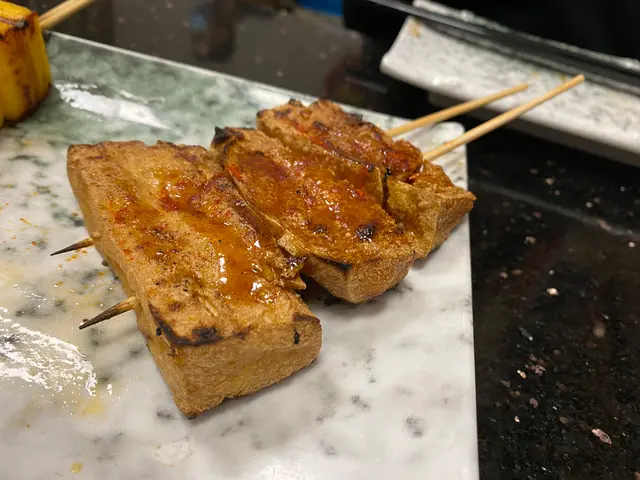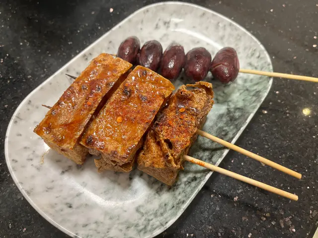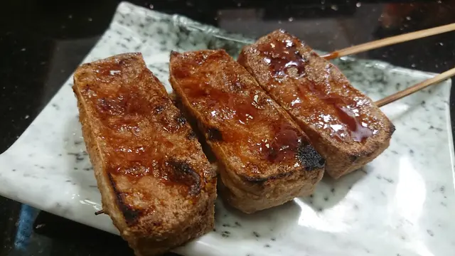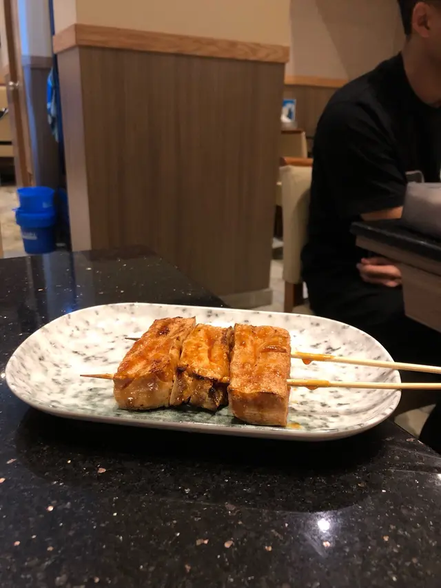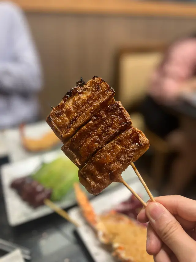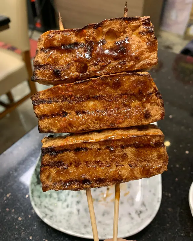 。泰式燒豚肉豚肉切成適中的薄片,份量不少。豚肉燒得恰到好處,表面帶著誘人的焦香,肉質嫩滑多汁。搭配特製泰式的醬料,酸酸辣辣十分開胃,好吃。鴨胸串鴨胸保留帶皮的部分,油脂令鴨皮變得酥脆,外層金黃誘人,而內部的鴨肉則保持粉嫩多汁,充滿香氣。燒日本芝士年糕烤至外脆內軟,軟糯的年糕與融化的芝士完美結合,口感層次豐富。蒜蓉燒茄子(原條)蒜蓉均勻地覆蓋在燒烤後的茄子表面,賣相吸引。燒茄子滑嫩多汁,充份吸收了蒜蓉醬料特有的濃郁香氣,又帶著茄子自然的甜味與燒烤香氣,味道豐富。串燒豆腐豆腐醬汁微甜惹味,外皮焦香而內嫩有汁,有驚喜。特式蒜蓉包(配原粒蒜頭)共有4件,上桌時已散發出誘人的蒜香。蒜蓉包色澤金黃,外層超級香脆,就連坐在對面的友人都聽到酥脆聲!烤原粒蒜頭味道濃郁甘甜,輕輕一擠就能讓蒜蓉滑出。整個蒜蓉包外脆內鬆軟,配搭蒜蓉均勻塗抹在麵包上,每一口都能感受到濃烈蒜香,口感層次豐富,令人回味無窮。開心果乳酪由開心果粒、開心果醬、乳酪組成。濃郁的開心果味搭配口感柔滑的乳酪,整體充滿堅果香氣,香而不膩,口感及層次十分豐富總結來說,食物種類多又美味,而且營業至凌晨,喜歡夜生活的我們會再光顧…查看更多