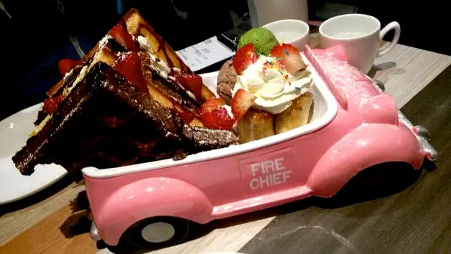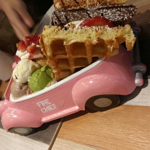 車的顏色似乎不只一種,還有藍色的。雪糕也不太甜,男生也能接受的味道!和爸爸每人兩件窩夫。除了當中的士多啤梨有點酸外,整體也很好吃。味道十足,相信會來第三次!…查看更多