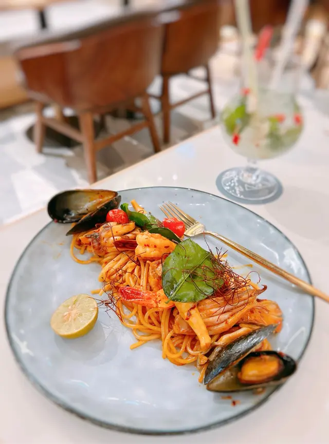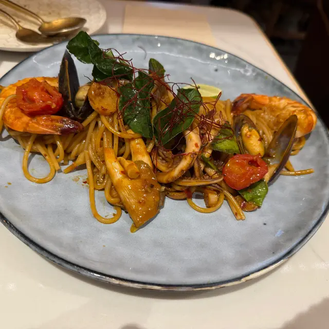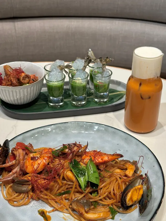🙋🏻♂️餓底探員去尖沙咀調查呢間泰國菜,餐廳走木系風格,泰國直送食材及私房製醬汁,以新派手法融合於西式菜餚入面,主打泰西fusion菜式,仲有私房泰式粉麵,創意手工甜品,特飲同雞尾酒,可以體驗到不一樣嘅泰式風情🍗泰鹹蛋黃金單骨雞翼 $78🙋🏻♂️表示單骨雞翼炸到金黃色,表面以鹹蛋黃醬包住,外脆內軟,雞肉嫩滑多汁,食落充滿住鹹蛋黃醬嘅鹹香,香口惹味🦀脆炸軟殼蟹米紙卷配牛油果醬 $128🙋🏻♂️表示香滑軟糯嘅米紙卷包住脆炸軟殼蟹,口感對比強烈,軟殼蟹炸得香脆,肉質鮮甜,配上香濃牛油果醬,增添清新氣息🍝冬蔭功濃汁虎蝦意大利麵 $148🙋🏻♂️表示以傳統泰式冬蔭功融合意大利麵,配上大蝦,青口,魷魚等海鮮,麵質彈牙,每啖都充滿濃郁冬蔭功汁,香辣惹味,將泰西料理完美結合🍜清萊咖喱豬頸肉金麵 $86🙋🏻♂️表示呢個金麵係泰北經典麵食,麵質爽彈充滿蛋香,配上香軟爽口嘅豬頸肉,咖喱湯頭辛香濃郁,帶有濃厚椰香,面頭放上脆炸嘅麵條增添口感🍋阿閒泰氮氣冷泡檸檬茶 $58🙋🏻♂️表示檸檬茶用港式茶底配上西式茶葉,以冷泡方式處理,配上鮮榨檸檬汁,冷泡茶注入氮氣形成泡沫,飲落香醇細滑,營造出啤酒般嘅口感,非常特別🍵阿閒泰奶綠 $48🙋🏻♂️表示綠茶同奶形色夢幻嘅漸層,飲落茶味甘香,底層有香甜嘅煉奶,配上經焦糖化嘅香蕉,增添甜蜜氣息📈吃貨指數😋好味度 9/10🔙返啅度 9/10…查看更多