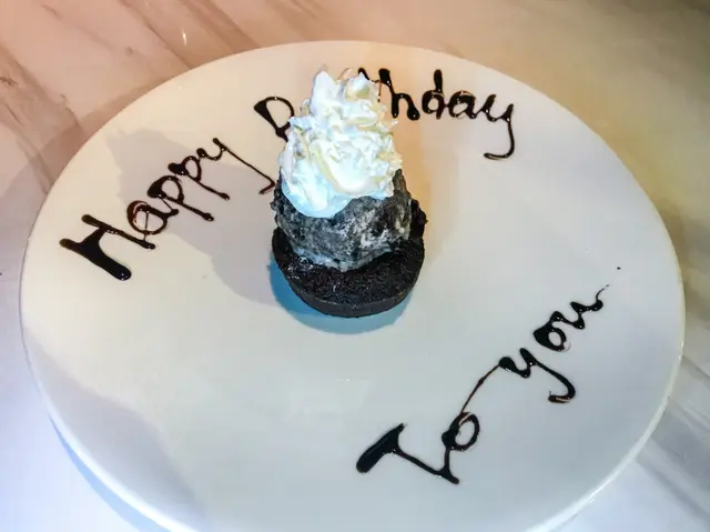 沒用鐵板所以沒有冒煙的感覺,但插上了一支煙花XX,碟特別寫著Happy Birthday的慶祝字眼,當我們拍完照也都差不多熄了。.試試先,味道是不錯但真得頗暖的,朱古力軟餅並不是心太軟的那種流心而是實心的蛋糕類,口感不是太紮實,軟軟的,沾著朱古力醬及冰凍的雪糕一起吃,口感會變得濕軟呀!味道好甜但唔會話甜到好膩,不錯!