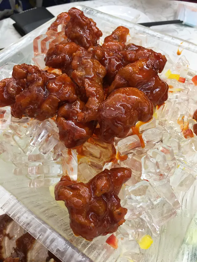 再戰富東閣片皮鴨,今次搵埋飯腳友,四個人去食可以食多啲嘢。片皮鴨,保持水準,有皮有肉冇肥膏,好味。二食今次要咗炒鴨絲,韭菜、芽菜、青蔥炒鴨絲,有鑊氣,味道合格。冰鎮咕嚕肉,上次見到隔離枱食好吸引,今次人多終於可以試。煮起熱辣辣,放上啲冰度搞到個面凍冰冰,口感又幾得意。冬瓜盅,好耐冇食過了,大大舊去皮冬瓜環,仲有必備嘅夜香花、絲瓜、瑤柱、蟹柳、蝦,夠哂足料。海鮮雜菜煲,又係大大份,超多料。薑蔥蠔煲,同樣份量十足(足足有十隻蠔),夠哂火喉,香噴噴。六個餸,連埋茶錢加一,都係$878,認真抵食。…查看更多