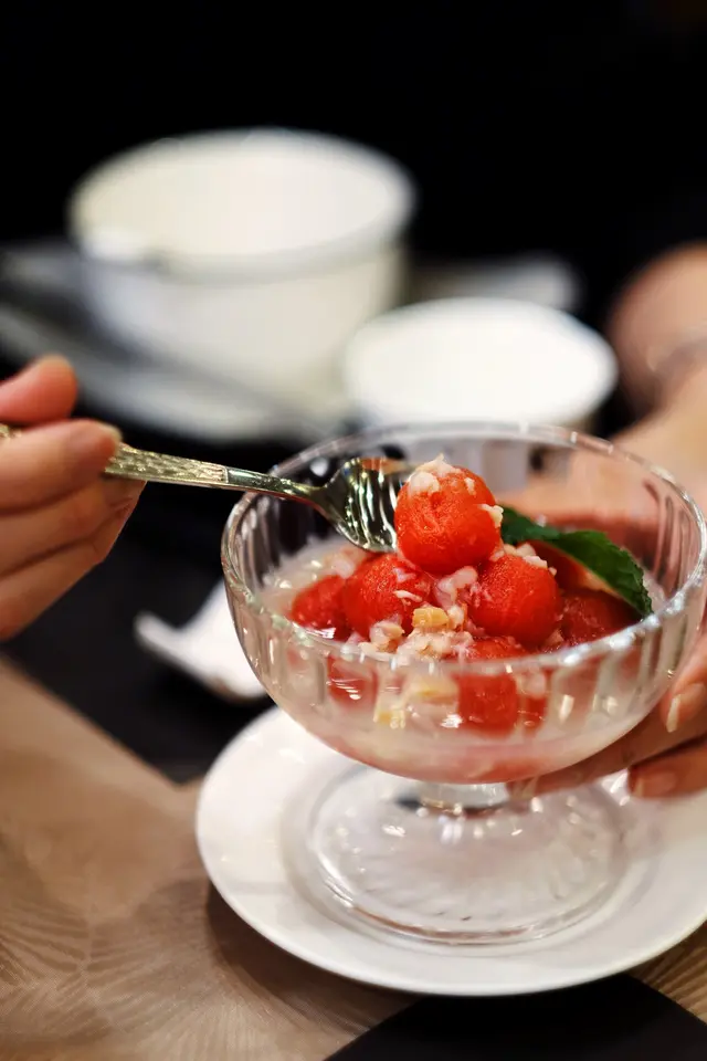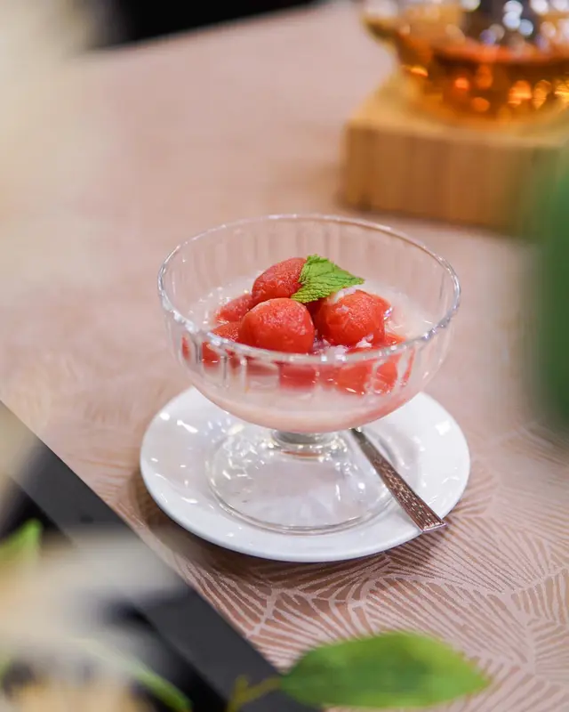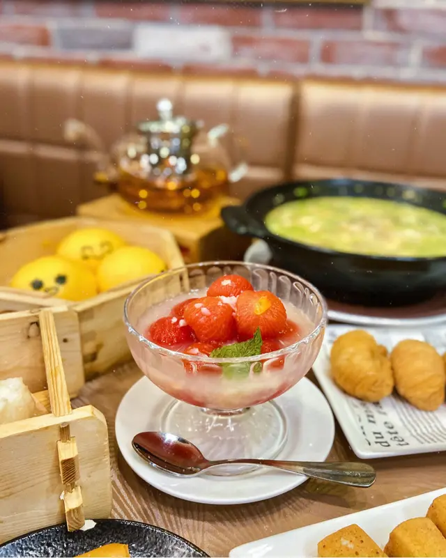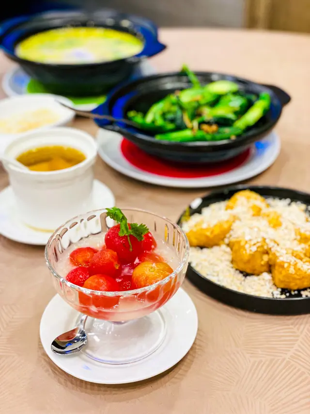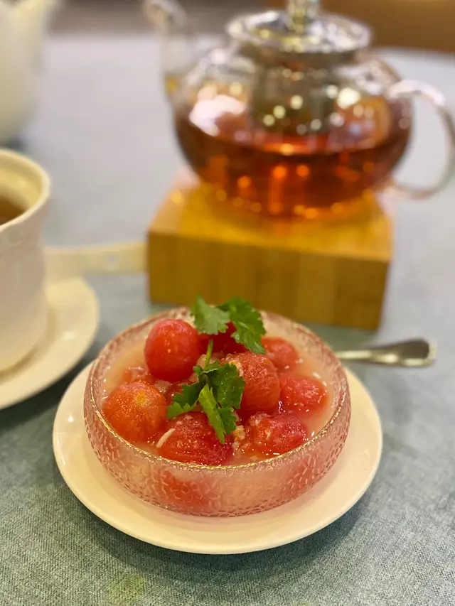 尖東好時中心角落有間fusion酒樓飲茶,中國茶、花茶都有,仲有得坐熱嚟飲,嘢食點心都有啲中西合壁嘅菜式,同時滿足到老人家鍾意中菜、細路鍾意西餐嘅口味。人流唔多,坐得疏落,可以靜靜地一班親朋好友飲吓茶。蟲草花豬展燉雞 (位) $48媽媽湯水嘅味道!清甜又唔會重味精,豬展、雞腳已經燉到軟綿,一人一盅滋潤吓好正!小館冰鎮咕嚕黑豚肉 $178滿滿嘅仙氣~乾冰嘅煙+一座大冰山,挖開中間係咕嚕肉。雖然size細份量唔多,但真係幾好食幾特別。薄薄嘅炸衣冰到凍凍地,好似個殼咁,咬落脆卜卜。入面嘅豚肉雖則偏韌,但肉味香,又冇落鬆肉粉,抵讚!冰鎮荔枝西紅柿 $68夏日炎炎涼品,生番茄味偏重,浸住荔枝汁,冰冰涼涼微微酸。金湯松露餃 $48外皮係粉果皮,煙韌有厚度,入面係滿滿嘅菇菇,黑松露味道香得嚟又唔會太石油氣。運程流沙包 $38三款唔同嘅樣,款款都好可愛。我坐正風口位,所以凍得好快🥲包身偏向硬身,奶皇餡料半流沙,奶香比鹹蛋黃味強烈好多,而且唔食到成口油。桂花紅酒雪梨 $68雪梨清水潤喉,味道唔會太甜,口感爽脆,紅酒味濃烈,桂花味相對較弱。…查看更多