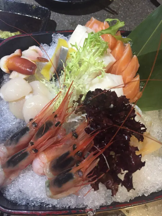 非常抵吃,但朋友不太愛好生蠔就沒加了!環境也算寬敞舒適,近門口的卡位適合吃爐端燒用。來吃放題必點刺身,因為抱病在身,胃口不佳,只好節制一點,先吃少量刺身,甜蝦和油甘魚特別新鮮好味
