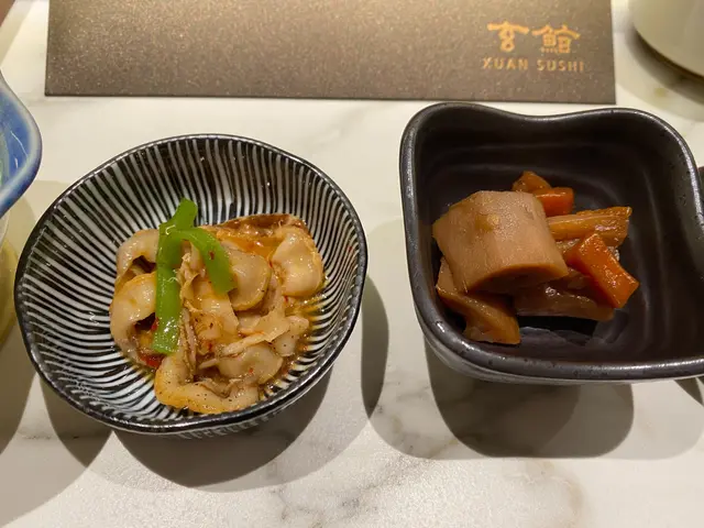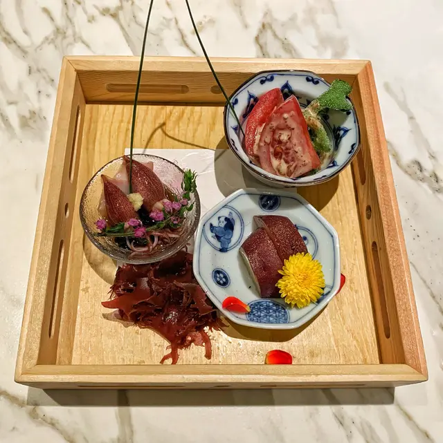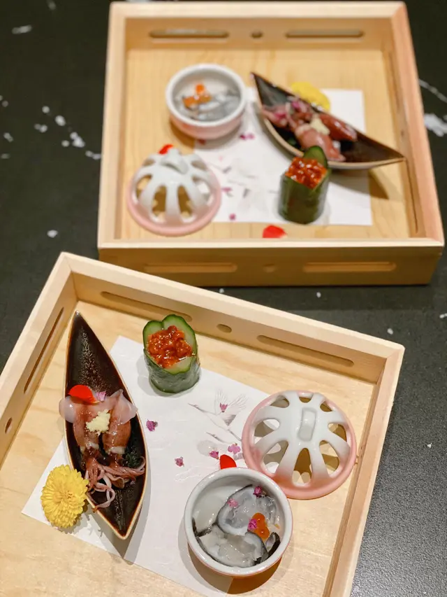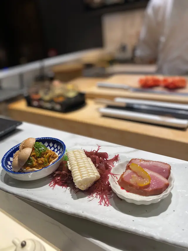 廚師發辦的愈開愈多足以證明香港對高質素的日本料理的喜愛程度有多高,而這間算是其中間我很喜歡餐廳之一,基本上來這吃都不會失望的,最近發生了開心的事,就跟朋友來一起吃頓好的!商務版omakase(1200元/人)前菜今天的前菜是冷湯鮑魚和蟹膏蟹肉豆腐。冷湯鮑魚吃起來爽甜,而且帶一點點的薑味,味道挺特別!而蟹膏蟹肉豆腐入口滑嫩,但又有濃濃的蟹膏蟹肉的鮮味和濃香,剛好可以叫醒一下味蕾!刺身刺身一共有六款,分別是板越生蠔,黑鯛魚,鰤魚和野生藍鰭吞拿魚赤身,中拖羅和大拖羅。板越生蠔不要看他小小的一隻,但其實是非常厚肉的,入口味道鮮甜,嫩滑無渣,而且還很特別的配上海葡萄來增加了爽脆的口感!黑鯛魚是第一次吃到,質感比平常的鯛魚更有彈性,爽中帶嫩,挺特別的!鰤魚質感滑嫩,但有油香,而且魚味挺濃的!野生藍鰭吞拿魚,想不到在這個套餐也能吃到野生的,真的挺不錯,而且一次過包括了三款口味,令你一次過品賞到吞拿魚的滋味!赤身較結實,但魚味濃香。中拖羅既有赤身的魚味,又有大拖羅的油香。大拖羅入口即化,滿滿魚油的香味!和食今天的是鐵板牛油煎大蝦。大蝦真的挺大一樣,肉非常飽滑,肉質爽滑,蝦味濃郁,而且蝦頭的部位還有蝦膏,吃起來更濃香!除了大蝦外,還有煎得滑嫩的帆立貝,爽甜的香菇和帶點辣的日本青椒。壽司壽司就有五款,都挺有特色的!金目鯛壽司比較常見,但肉質細膩,質感軟滑。銀鱈魚壽司很少見這個可以用來做刺身的,但店員說是用上刺身級別的銀鱈魚,吃起來質感柔軟,帶點綿滑口感,但魚味挺香的!鰝鰺魚壽司這個就是池魚,但是高級一點的,這吃起來油份較多,油香很突出,但魚味也很濃香!帆立貝壽司用上一整隻的北海道帆立貝包上小小的壽司飯,入口是滿滿帆立貝的鮮甜味,質感滑嫩。海膽壽司這用上大量的北海道馬糞海膽,飯都全部被海膽蓋著,賣相非常邪惡!這吃起來味道非常鮮甜,而且入口即化,壽司飯很好地帶出海膽的甜,再加上紫菜也為海膽增加不少的滋味!湯物今天的是魚湯烏冬,調味非常簡單,就是濃濃的魚湯,加上蔥花和昆布,配上烏冬,吃起來是濃濃的魚香味,配上滑嫩的烏冬,簡單但味道很好!甜品今天的是靜崗蜜瓜,是日本非常有名的蜜瓜之一,入口香甜,但甜而不膩,帶種清爽的感覺!…查看更多