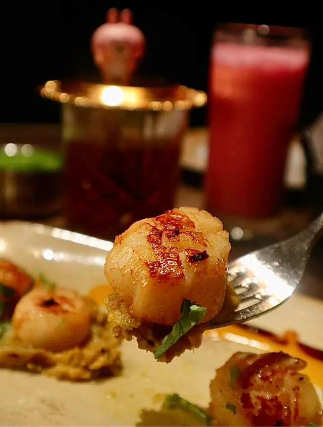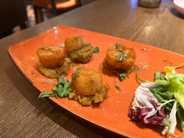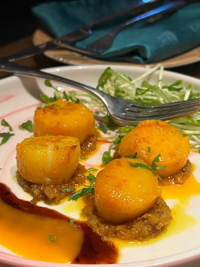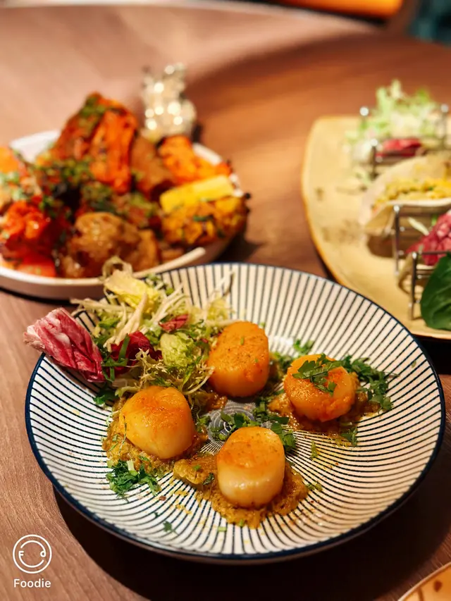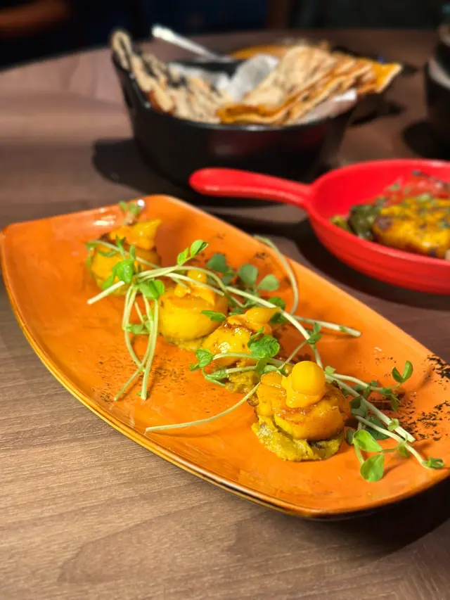 想去印度旅遊,但又怕食唔慣當地食物,可以搵間印度餐廳一試。除左有清真認証,更位於尖沙咀地鐵站附近。「五香羊肉餅」看似尋常小食,羊肉餡料處理得恰到好處,而不帶絲毫羶味。「南印度烤帶子伴茄子菠蘿果醬」,厚實肥美帶子,表面烤出誘人焦痕,內裡保持著通透狀態,品質極佳。搭配的茄子,菠蘿果醬,開胃而略帶神印度風味。「烤珍寶大蝦」大蝦肉質無可挑剔,火候掌控精準好,蝦肉焦香,彈牙與鮮甜。「洋蔥紅茄香汁燴雞球」番茄與洋蔥經慢燴後融為一體,化成濃郁而溫潤的醬汁,每一顆嫩滑雞球一同沾上。雞件嫩滑多汁而不柴。「香草烤羊柳」,經過一輪烹調過程後,亦牢牢鎖住羊柳內部的肉汁,咬開羊柳,肉質嫩滑與濃郁的肉香,又嗅撲鼻的香草氣息,「松露芝士烤餅」經過發酵與烤製,而松露醬的加入,將這道樸實的烤餅升華了境界。外皮酥脆,內裡充滿空氣感。「牛油烤餅」即叫即做,撒滿飄香的牛油,餅邊有牛油香氣。Mango LassiAperol Spritz服務人員態度殷勤,出菜快,清潔亦快手,吃得滿意滿足。…查看更多